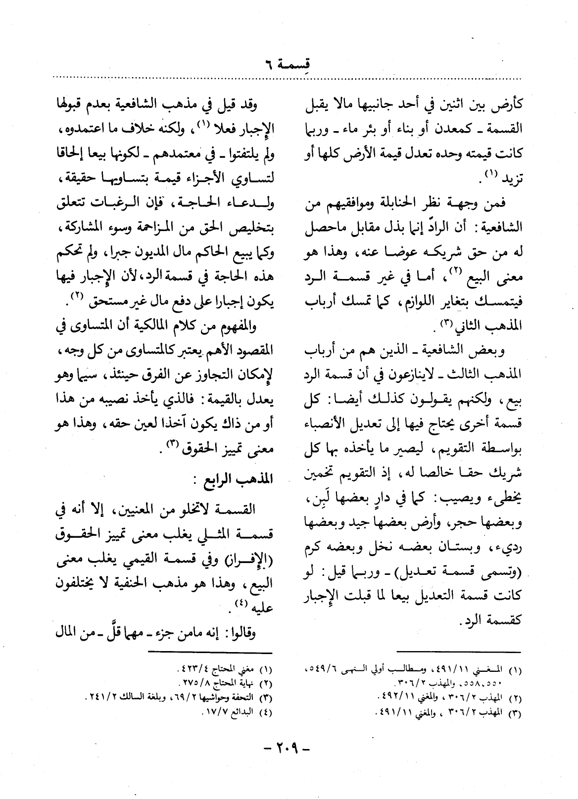 وَقَدْ قِيل فِي مَذْهَبِ الشَّافِعِيَّةِ بِعَدَمِ قَبُولِهَا الإِْجْبَارَ فِعْلاً (1) ، وَلَكِنَّهُ خِلاَفُ مَا اعْتَمَدُوهُ، وَلَمْ يَلْتَفِتُوا - فِي مُعْتَمَدِهِمْ - لِكَوْنِهَا بَيْعًا إِلْحَاقًا لِتَسَاوِي الأَْجْزَاءِ قِيمَةً بِتَسَاوِيهَا حَقِيقَةً، وَلِدُعَاءِ الْحَاجَةِ، فَإِنَّ الرَّغَبَاتِ تَتَعَلَّقُ بِتَخْلِيصِ الْحَقِّ مِنَ الْمُزَاحَمَةِ وَسُوءِ الْمُشَارَكَةِ، وَكَمَا يَبِيعُ الْحَاكِمُ مَال الْمَدْيُونِ جَبْرًا، وَلَمْ تُحَكَّمْ هَذِهِ الْحَاجَةُ فِي قِسْمَةِ الرَّدِّ؛ لأَِنَّ الإِْجْبَارَ فِيهَا يَكُونُ إِجْبَارًا عَلَى دَفْعِ مَالٍ غَيْرِ مُسْتَحَقٍّ (2) .
