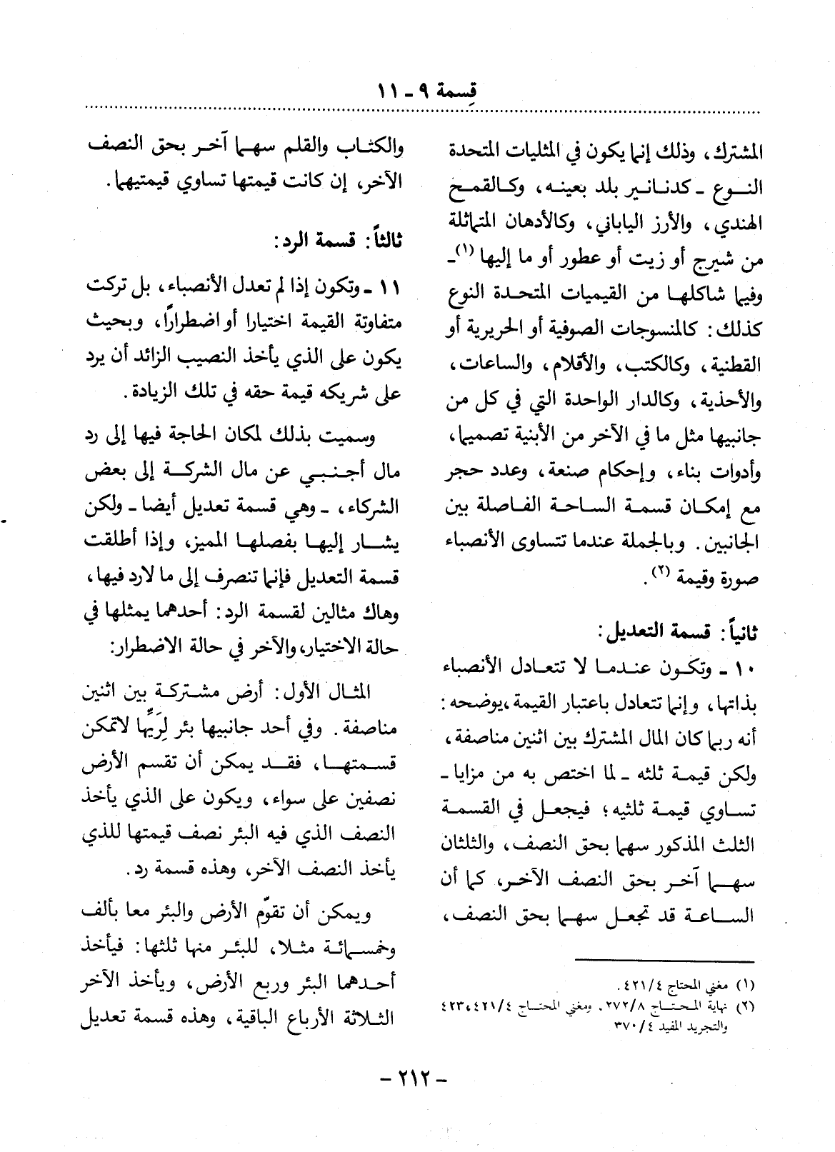 10 - وَتَكُونُ عِنْدَمَا لاَ تَتَعَادَل الأَْنْصِبَاءُ بِذَاتِهَا، وَإِنَّمَا تَتَعَادَل بِاعْتِبَارِ الْقِيمَةِ، يُوَضِّحُهُ: أَنَّهُ رُبَّمَا كَانَ الْمَال الْمُشْتَرَكُ بَيْنَ اثْنَيْنِ مُنَاصَفَةً. وَلَكِنَّ قِيمَةَ ثُلُثِهِ - لِمَا اخْتُصَّ بِهِ مِنْ مَزَايَا - تُسَاوِي قِيمَةَ ثُلُثَيْهِ؛ فَيُجْعَل فِي الْقِسْمَةِ الثُّلُثُ الْمَذْكُورُ سَهْمًا بِحَقِّ النِّصْفِ، وَالثُّلُثَانِ سَهْمًا آخَرَ بِحَقِّ النِّصْفِ الآْخَرِ، كَمَا أَنَّ السَّاعَةَ قَدْ تُجْعَل سَهْمًا بِحَقِّ النِّصْفِ،