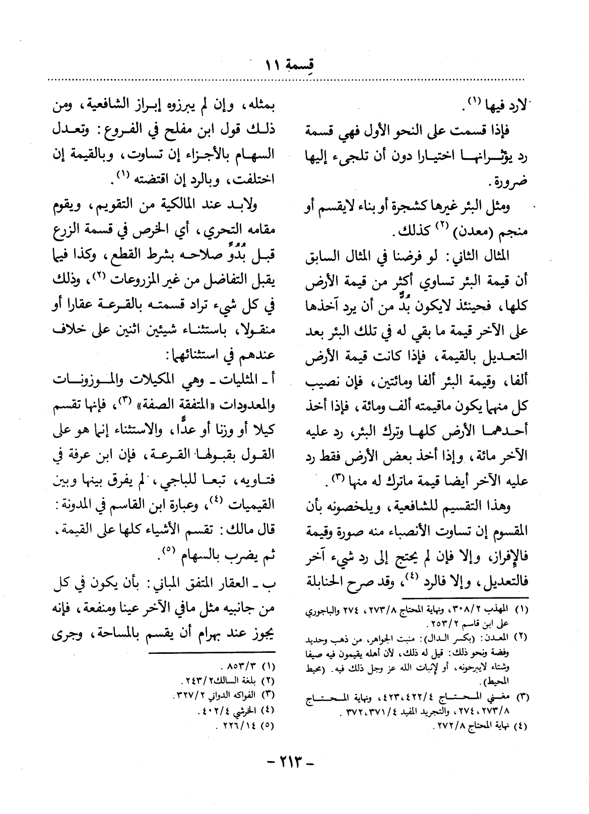 الْمِثَال الثَّانِي: لَوْ فَرَضْنَا فِي الْمِثَال السَّابِقِ أَنَّ قِيمَةَ الْبِئْرِ تُسَاوِي أَكْثَرَ مِنْ قِيمَةِ الأَْرْضِ كُلِّهَا، فَحِينَئِذٍ لاَ يَكُونُ بُدٌّ مِنْ أَنْ يَرُدَّ آخُذُهَا عَلَى الآْخَرِ قِيمَةَ مَا بَقِيَ لَهُ فِي تِلْكَ الْبِئْرِ بَعْدَ التَّعْدِيل بِالْقِيمَةِ، فَإِذَا كَانَتْ قِيمَةُ الأَْرْضِ أَلْفًا، وَقِيمَةُ الْبِئْرِ أَلْفًا وَمِائَتَيْنِ، فَإِنَّ نَصِيبَ كُلٍّ مِنْهُمَا يَكُونُ مَا قِيمَتُهُ أَلْفٌ وَمِائَةٌ، فَإِذَا أَخَذَ أَحَدُهُمَا الأَْرْضَ كُلَّهَا وَتَرَكَ الْبِئْرَ، رَدَّ عَلَيْهِ الآْخَرُ مِائَةً، وَإِذَا أَخَذَ بَعْضَ الأَْرْضِ فَقَطْ رَدَّ عَلَيْهِ الآْخَرُ أَيْضًا قِيمَةَ مَا تَرَكَ لَهُ مِنْهَا (3) .