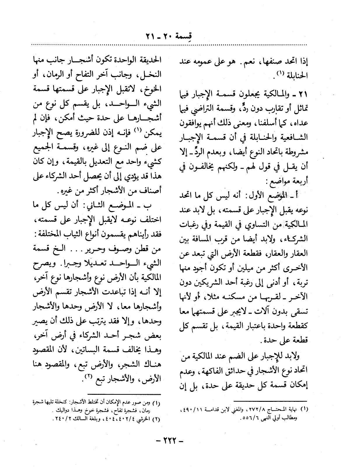 ب - الْمَوْضِعُ الثَّانِي: أَنْ لَيْسَ كُل مَا اخْتَلَفَ نَوْعُهُ لاَ يَقْبَل الإِْجْبَارَ عَلَى قِسْمَتِهِ، فَقَدْ رَأَيْنَاهُمْ يَقْسِمُونَ أَنْوَاعَ الثِّيَابِ الْمُخْتَلِفَةِ: مِنْ قُطْنٍ وَصُوفٍ وَحَرِيرٍ. . . إِلَخْ قِسْمَةَ الشَّيْءِ الْوَاحِدِ تَعْدِيلاً وَجَبْرًا. وَيُصَرِّحُ الْمَالِكِيَّةُ بِأَنَّ الأَْرْضَ نَوْعٌ وَأَشْجَارَهَا نَوْعٌ آخَرُ، إِلاَّ أَنَّهُ إِذَا تَبَاعَدَتِ الأَْشْجَارُ تُقْسَمُ الأَْرْضُ وَأَشْجَارُهَا مَعًا، لاَ الأَْرْضُ وَحْدَهَا وَالأَْشْجَارُ وَحْدَهَا، وَإِلاَّ فَقَدْ يَتَرَتَّبُ عَلَى ذَلِكَ أَنْ يَصِيرَ بَعْضُ شَجَرِ أَحَدِ الشُّرَكَاءِ فِي أَرْضٍ آخَرَ، وَهَذَا يُخَالِفُ قِسْمَةَ الْبَسَاتِينِ؛ لأَِنَّ الْمَقْصُودَ هُنَاكَ الشَّجَرُ، وَالأَْرْضُ تَبَعٌ، وَالْمَقْصُودُ هُنَا الأَْرْضُ، وَالأَْشْجَارُ تَبَعٌ (2) .