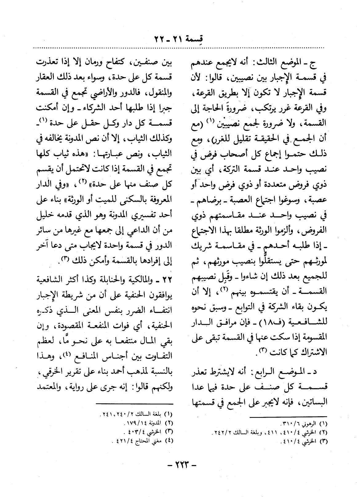 ج - الْمَوْضِعُ الثَّالِثُ: أَنَّهُ لاَ يُجْمَعُ عِنْدَهُمْ فِي قِسْمَةِ الإِْجْبَارِ بَيْنَ نَصِيبَيْنِ، قَالُوا: لأَِنَّ قِسْمَةَ الإِْجْبَارِ لاَ تَكُونُ إِلاَّ بِطَرِيقِ الْقُرْعَةِ، وَفِي الْقُرْعَةِ غَرَرٌ يُرْتَكَبُ، ضَرُورَةَ الْحَاجَةِ إِلَى الْقِسْمَةِ، وَلاَ ضَرُورَةَ لِجَمْعِ نَصِيبَيْنِ (1) (مَعَ أَنَّ الْجَمْعَ فِي الْحَقِيقَةِ تَقْلِيلٌ لِلْغَرَرِ) ، وَمَعَ ذَلِكَ حَتَّمُوا إِجْمَاعَ كُل أَصْحَابِ فَرْضٍ فِي نَصِيبٍ وَاحِدٍ عِنْدَ قِسْمَةِ التَّرِكَةِ، أَيْ بَيْنَ ذَوِي فُرُوضٍ مُتَعَدِّدَةٍ أَوْ ذَوِي فَرْضٍ وَاحِدٍ أَوْ عَصَبَةٍ، وَسَوَّغُوا اجْتِمَاعَ الْعَصَبَةِ - بِرِضَاهُمْ - فِي نَصِيبٍ وَاحِدٍ عِنْدَ مُقَاسَمَتِهِمْ ذَوِي الْفُرُوضِ، وَأَلْزَمُوا الْوَرَثَةَ مُطْلَقًا بِهَذَا الاِجْتِمَاعِ - إِذَا طَلَبَهُ أَحَدُهُمْ - فِي مُقَاسَمَةِ شَرِيكٍ لِمُوَرِّثِهِمْ حَتَّى يَسْتَقِلُّوا بِنَصِيبِ مُوَرِّثِهِمْ، ثُمَّ لِلْجَمِيعِ بَعْدَ ذَلِكَ إِنْ شَاءُوا - وَقَبِل نَصِيبُهُمُ الْقِسْمَةَ - أَنْ يَقْتَسِمُوهُ بَيْنَهُمْ (2) ، إِلاَّ أَنْ يَكُونَ بَقَاءُ الشَّرِكَةِ فِي التَّوَابِعِ - وَسَبَقَ نَحْوُهُ لِلشَّافِعِيَّةِ (ف 18) - فَإِنَّ مَرَافِقَ الدَّارِ الْمَقْسُومَةِ إِذَا سُكِتَ عَنْهَا فِي الْقِسْمَةِ تَبْقَى عَلَى الاِشْتِرَاكِ كَمَا كَانَتْ (3) .
