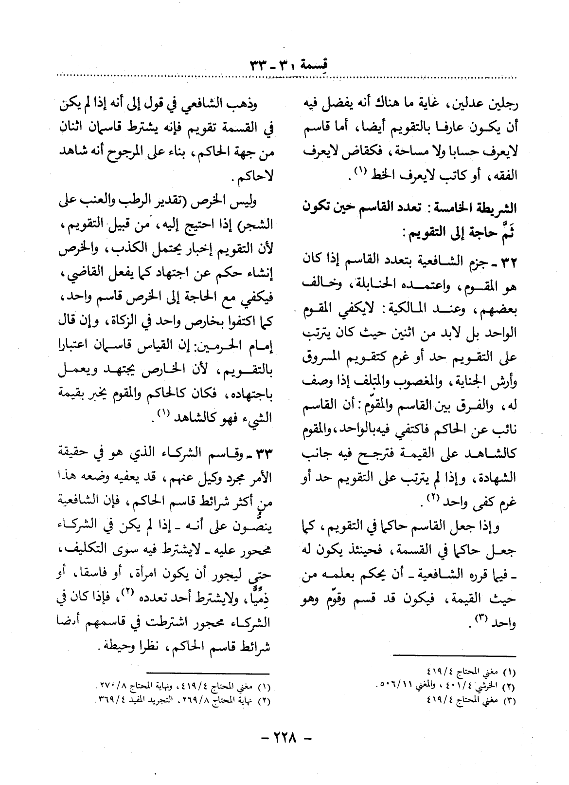 32 - جَزَمَ الشَّافِعِيَّةُ بِتَعَدُّدِ الْقَاسِمِ إِذَا كَانَ هُوَ الْمُقَوِّمَ، وَاعْتَمَدَهُ الْحَنَابِلَةُ، وَخَالَفَ بَعْضُهُمْ، وَعِنْدَ الْمَالِكِيَّةِ: لاَ يَكْفِي الْمُقَوِّمُ الْوَاحِدُ بَل لاَ بُدَّ مِنِ اثْنَيْنِ حَيْثُ كَانَ يَتَرَتَّبُ عَلَى التَّقْوِيمِ حَدٌّ أَوْ غُرْمٌ كَتَقْوِيمِ الْمَسْرُوقِ وَأَرْشِ الْجِنَايَةِ، وَالْمَغْصُوبِ وَالْمُتْلَفِ إِذَا وُصِفَ لَهُ، وَالْفَرْقُ بَيْنَ الْقَاسِمِ وَالْمُقَوِّمِ: أَنَّ الْقَاسِمَ نَائِبٌ عَنِ الْحَاكِمِ فَاكْتُفِيَ فِيهِ بِالْوَاحِدِ، وَالْمُقَوِّمُ كَالشَّاهِدِ عَلَى الْقِيمَةِ فَتُرَجَّحُ فِيهِ جَانِبُ الشَّهَادَةِ، وَإِذَا لَمْ يَتَرَتَّبْ عَلَى التَّقْوِيمِ حَدٌّ أَوْ غُرْمٌ كَفَى وَاحِدٌ (2) .