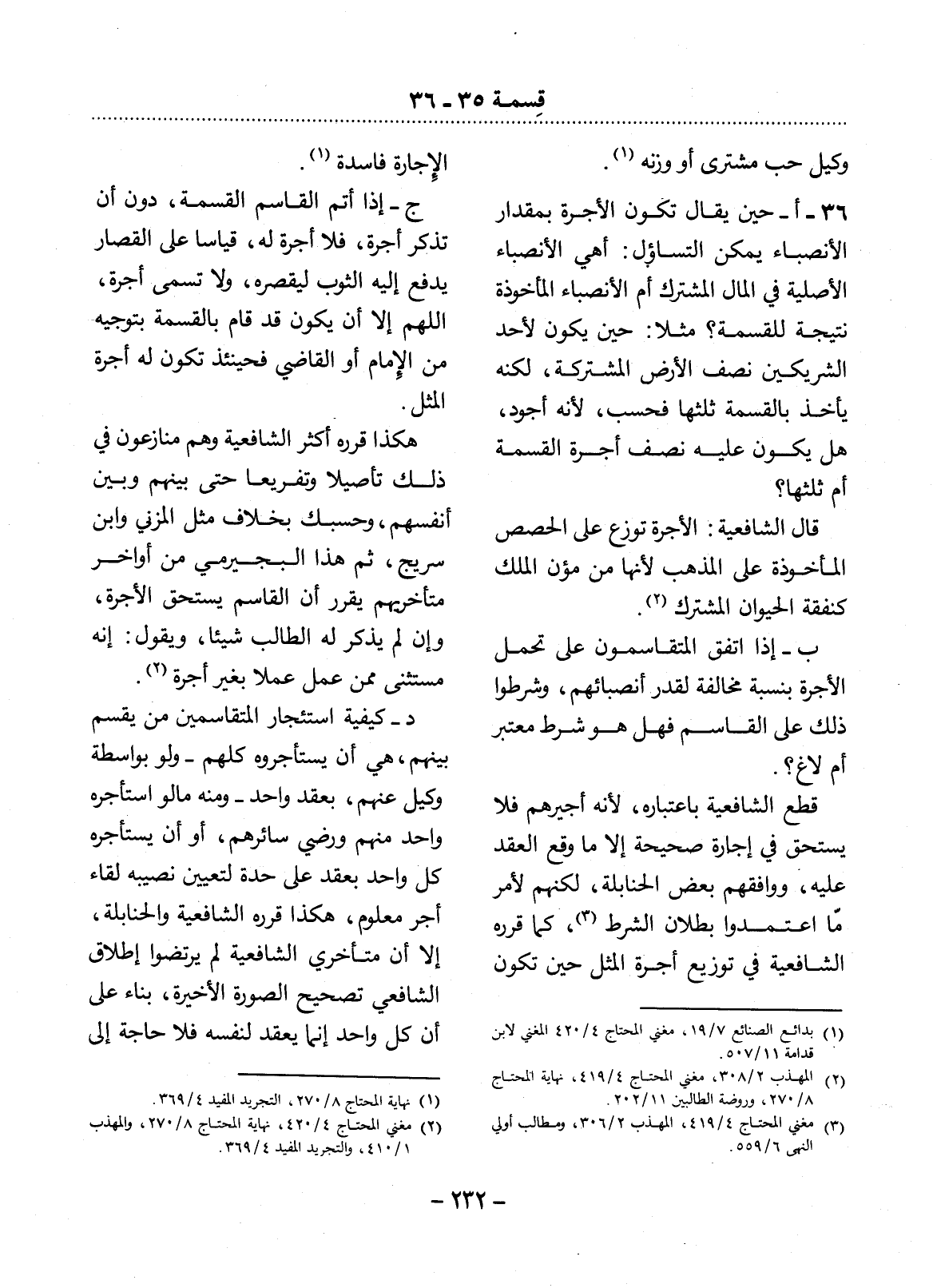36 - أ - حِينَ يُقَال تَكُونُ الأُْجْرَةُ بِمِقْدَارِ الأَْنْصِبَاءِ يُمْكِنُ التَّسَاؤُل: أَهِيَ الأَْنْصِبَاءُ الأَْصْلِيَّةُ فِي الْمَال الْمُشْتَرَكِ أَمِ الأَْنْصِبَاءُ الْمَأْخُوذَةُ نَتِيجَةً لِلْقِسْمَةِ؟ مَثَلاً: حِينَ يَكُونُ لأَِحَدِ الشَّرِيكَيْنِ نِصْفُ الأَْرْضِ الْمُشْتَرَكَةِ، لَكِنَّهُ يَأْخُذُ بِالْقِسْمَةِ ثُلُثَهَا فَحَسْبُ؛ لأَِنَّهُ أَجْوَدُ، هَل يَكُونُ عَلَيْهِ نِصْفُ أُجْرَةِ الْقِسْمَةِ أَمْ ثُلُثُهَا؟