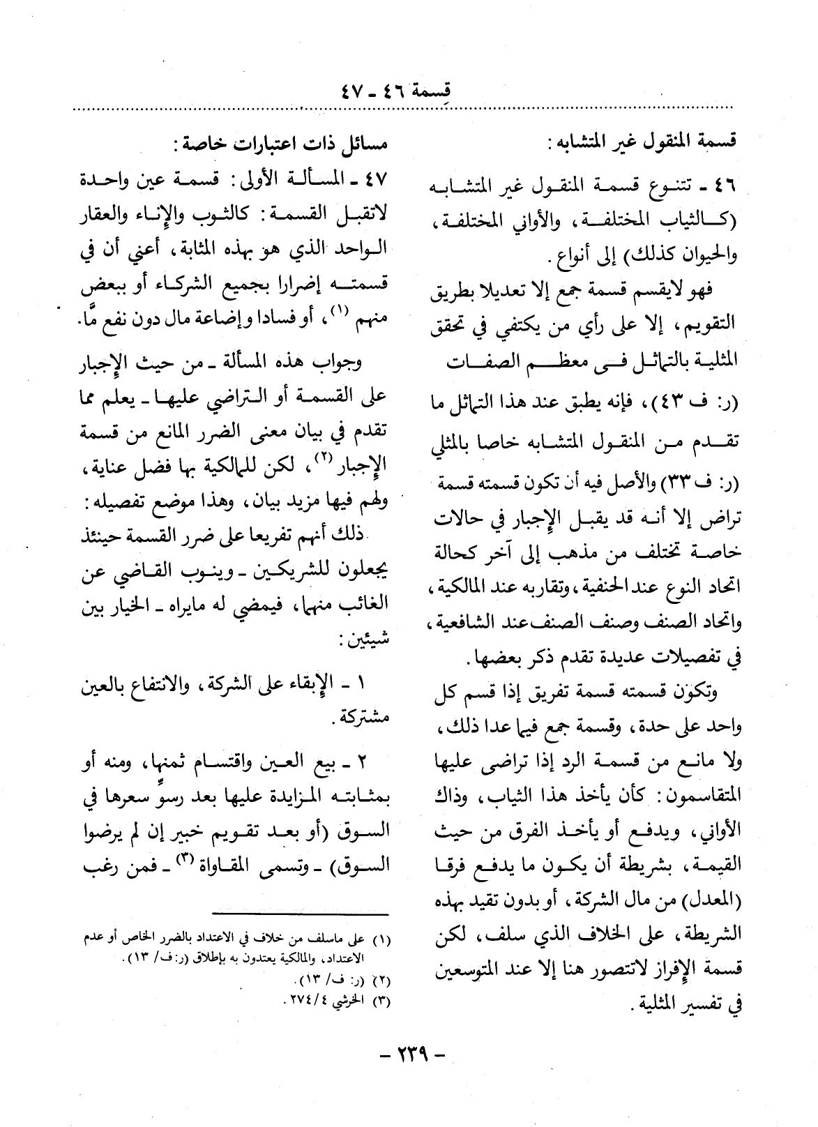 46 - تَتَنَوَّعُ قِسْمَةُ الْمَنْقُول غَيْرِ الْمُتَشَابِهِ (كَالثِّيَابِ الْمُخْتَلِفَةِ، وَالأَْوَانِي الْمُخْتَلِفَةِ، وَالْحَيَوَانِ كَذَلِكَ) إِلَى أَنْوَاعٍ.