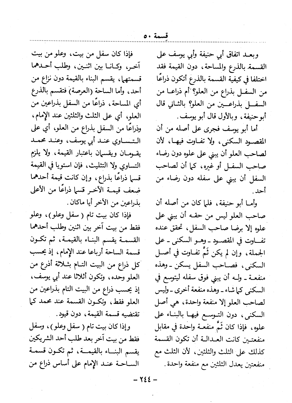 وَبَعْدَ اتِّفَاقِ أَبِي حَنِيفَةَ وَأَبِي يُوسُفَ عَلَى الْقِسْمَةِ بِالذَّرْعِ وَالْمِسَاحَةِ، دُونَ الْقِيمَةِ فَقَدِ اخْتَلَفَا فِي كَيْفِيَّةِ الْقِسْمَةِ بِالذَّرْعِ أَتَكُونُ ذِرَاعًا مِنَ السُّفْل بِذِرَاعٍ مِنَ الْعُلُوِّ؟ أَمْ ذِرَاعًا مِنَ السُّفْل بِذِرَاعَيْنِ مِنَ الْعُلُوِّ؟ بِالثَّانِي قَال أَبُو حَنِيفَةَ، وَبِالأَْوَّل قَال أَبُو يُوسُفَ.