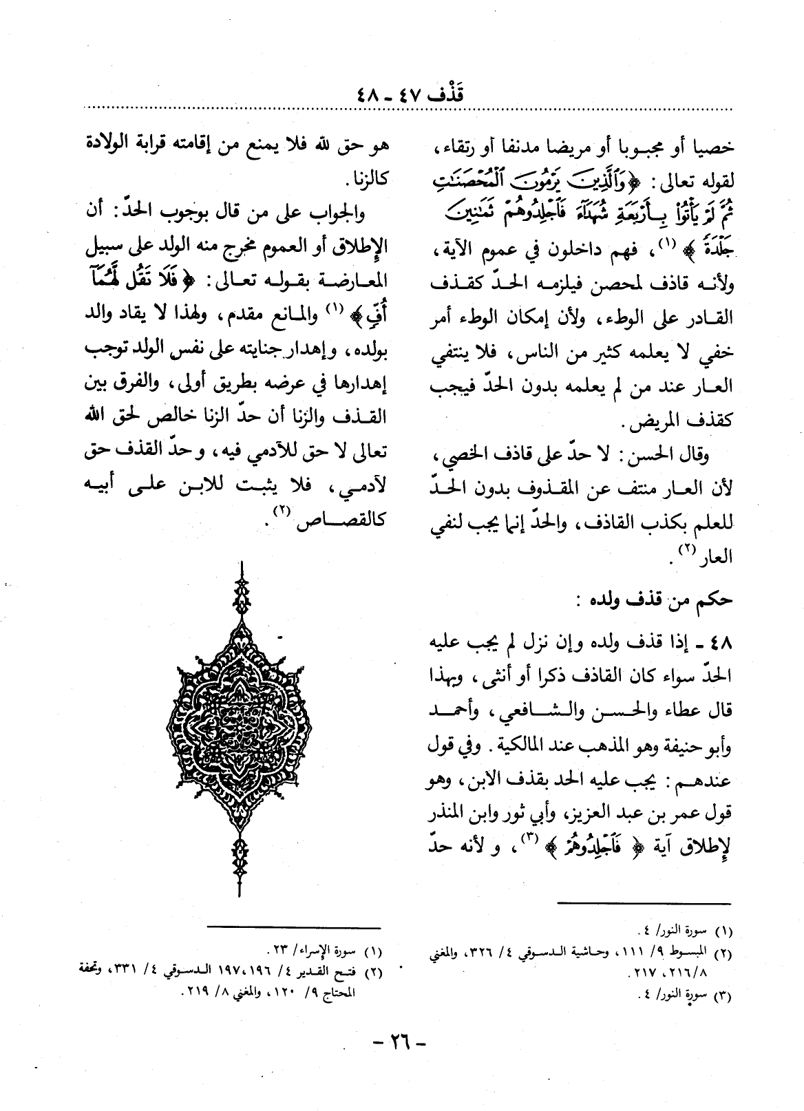 48 - إِذَا قَذَفَ وَلَدَهُ وَإِنْ نَزَل لَمْ يَجِبْ عَلَيْهِ الْحَدُّ سَوَاءٌ كَانَ الْقَاذِفُ ذَكَرًا أَوْ أُنْثَى، وَبِهَذَا قَال عَطَاءٌ وَالْحَسَنُ وَالشَّافِعِيُّ وَأَحْمَدُ وَأَبُو حَنِيفَةَ وَهُوَ الْمَذْهَبُ عِنْدَ الْمَالِكِيَّةِ. وَفِي قَوْلٍ عِنْدَهُمْ: يَجِبُ عَلَيْهِ الْحَدُّ بِقَذْفِ الاِبْنِ، وَهُوَ قَوْل عُمَرَ بْنِ عَبْدِ الْعَزِيزِ، وَأَبِي ثَوْرٍ وَابْنِ الْمُنْذِرِ لإِِطْلاَقِ آيَةِ {فَاجْلِدُوهُمْ} (3) ، وَلأَِنَّهُ حَدٌّ