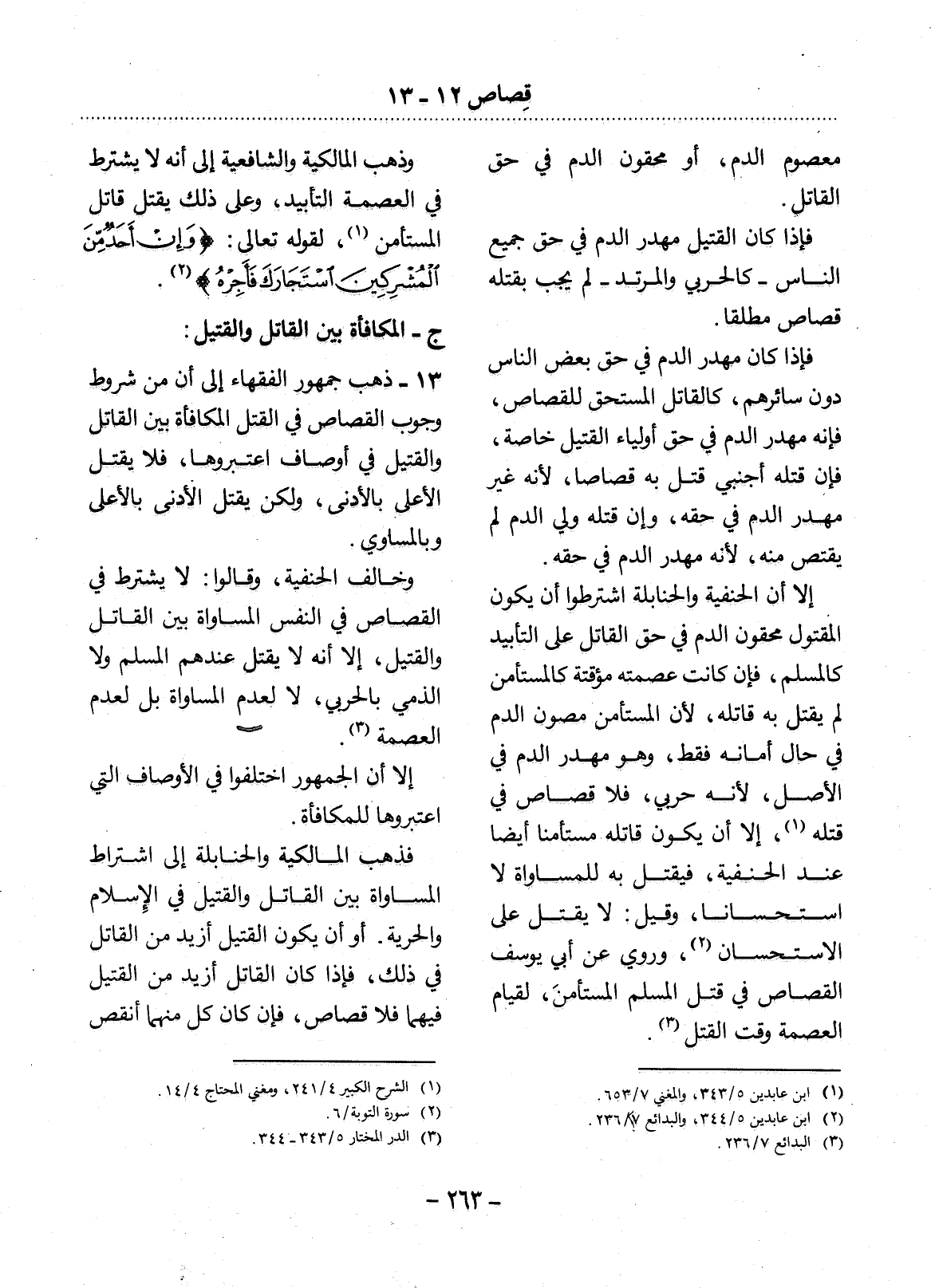 وَخَالَفَ الْحَنَفِيَّةُ، وَقَالُوا: لاَ يُشْتَرَطُ فِي الْقِصَاصِ فِي النَّفْسِ الْمُسَاوَاةُ بَيْنَ الْقَاتِل وَالْقَتِيل، إِلاَّ أَنَّهُ لاَ يُقْتَل عِنْدَهُمُ الْمُسْلِمُ وَلاَ الذِّمِّيُّ بِالْحَرْبِيِّ، لاَ لِعَدَمِ الْمُسَاوَاةِ بَل لِعَدَمِ الْعِصْمَةِ. (3)