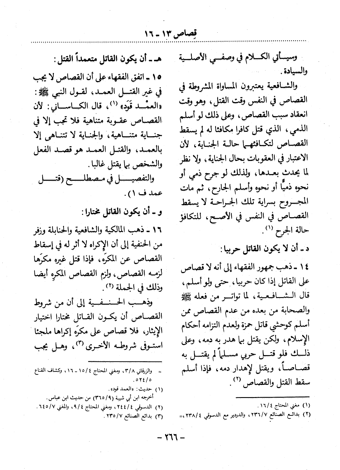 14 - ذَهَبَ جُمْهُورُ الْفُقَهَاءِ إِلَى أَنَّهُ لاَ قِصَاصَ عَلَى الْقَاتِل إِذَا كَانَ حَرْبِيًّا، حَتَّى وَلَوْ أَسْلَمَ، قَال الشَّافِعِيَّةُ، لِمَا تَوَاتَرَ مِنْ فِعْلِهِ صَلَّى اللَّهُ عَلَيْهِ وَسَلَّمَ وَالصَّحَابَةِ مِنْ بَعْدِهِ مِنْ عَدَمِ الْقِصَاصِ مِمَّنْ أَسْلَمَ كَوَحْشِيٍّ قَاتِل حَمْزَةَ وَلِعَدَمِ الْتِزَامِهِ أَحْكَامَ الإِْسْلاَمِ، وَلَكِنْ يُقْتَل بِمَا هُدِرَ بِهِ دَمُهُ، وَعَلَى ذَلِكَ فَلَوْ قَتَل حَرْبِيٌّ مُسْلِمًا لَمْ يُقْتَل بِهِ قِصَاصًا، وَيُقْتَل لإِِهْدَارِ دَمِهِ، فَإِذَا أَسْلَمَ سَقَطَ الْقَتْل وَالْقِصَاصُ. (2)