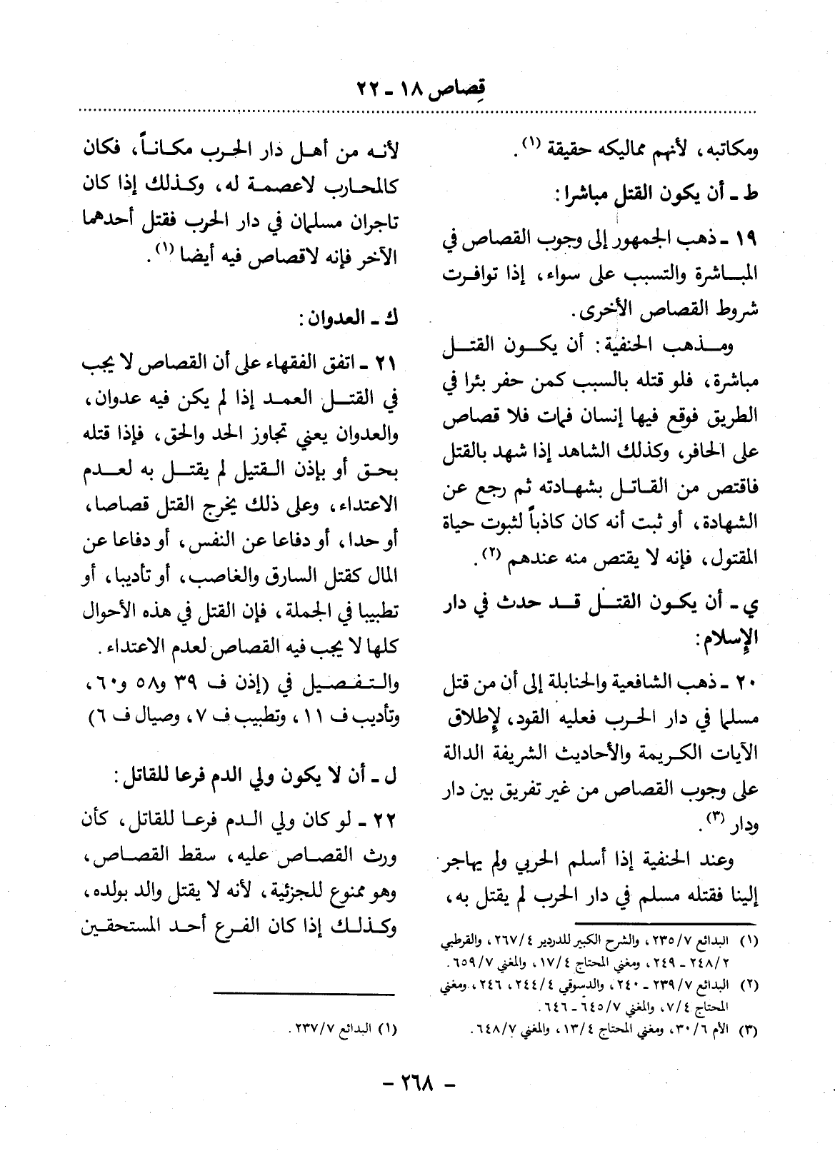 20 - ذَهَبَ الشَّافِعِيَّةُ وَالْحَنَابِلَةُ إِلَى أَنَّ مَنْ قَتَل مُسْلِمًا فِي دَارِ الْحَرْبِ فَعَلَيْهِ الْقَوَدُ، لإِِطْلاَقِ الآْيَاتِ الْكَرِيمَةِ وَالأَْحَادِيثِ الشَّرِيفَةِ الدَّالَّةِ عَلَى وُجُوبِ الْقِصَاصِ مِنْ غَيْرِ تَفْرِيقٍ بَيْنَ دَارٍ وَدَارٍ. (3)