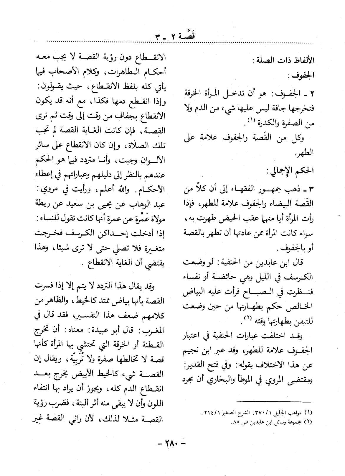 الاِنْقِطَاعِ دُونَ رُؤْيَةِ الْقَصَّةِ لاَ يَجِبُ مَعَهُ أَحْكَامُ الطَّاهِرَاتِ، وَكَلاَمُ الأَْصْحَابِ فِيمَا يَأْتِي كُلُّهُ بِلَفْظِ الاِنْقِطَاعِ، حَيْثُ يَقُولُونَ: وَإِذَا انْقَطَعَ دَمُهَا فَكَذَا، مَعَ أَنَّهُ قَدْ يَكُونُ الاِنْقِطَاعُ بِجَفَافٍ مِنْ وَقْتٍ إِلَى وَقْتٍ ثُمَّ تَرَى الْقَصَّةَ، فَإِنْ كَانَتِ الْغَايَةُ الْقَصَّةَ لَمْ تَجِبْ تِلْكَ الصَّلاَةُ، وَإِنْ كَانَ الاِنْقِطَاعُ عَلَى سَائِرِ الأَْلْوَانِ وَجَبَتْ، وَأَنَا مُتَرَدِّدٌ فِيمَا هُوَ الْحُكْمُ عِنْدَهُمْ بِالنَّظَرِ إِلَى دَلِيلِهِمْ وَعِبَارَاتِهِمْ فِي إِعْطَاءِ الأَْحْكَامِ. وَاللَّهُ أَعْلَمُ، وَرَأَيْتُ فِي مَرْوِيِّ: عَبْدِ الْوَهَّابِ عَنْ يَحْيَى بْنِ سَعِيدٍ عَنْ رَيْطَةَ مَوْلاَةِ عَمْرَةَ عَنْ عَمْرَةَ أَنَّهَا كَانَتْ تَقُول لِلنِّسَاءِ: إِذَا أَدْخَلَتْ إِحْدَاكُنَّ الْكُرْسُفَ فَخَرَجَتْ مُتَغَيِّرَةً فَلاَ تُصَلِّي حَتَّى لاَ تَرَى شَيْئًا، وَهَذَا يَقْتَضِي أَنَّ الْغَايَةَ الاِنْقِطَاعُ.