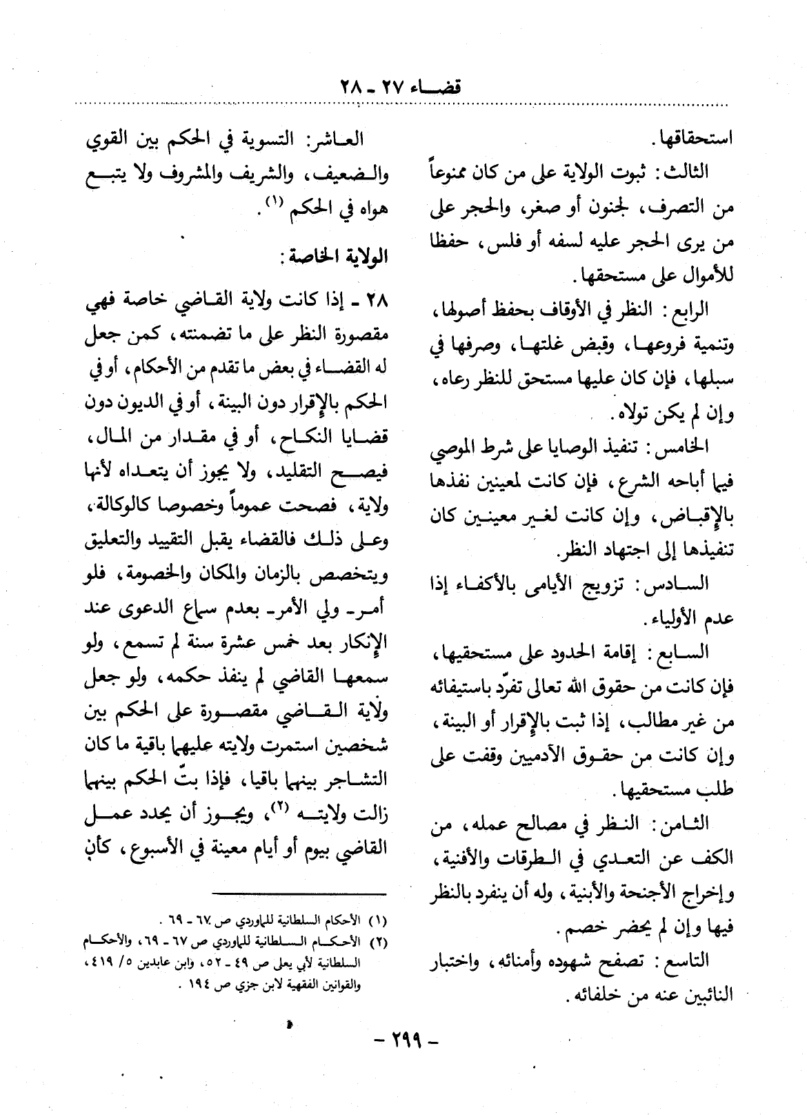 (2) الأحكام السلطانية للماوردي ص 67 - 69، والأحكام السلطانية لأبي يعلى ص 49 - 52، وابن عابدين 5 / 419، والقوانين الفقهية لابن جزي ص 194.