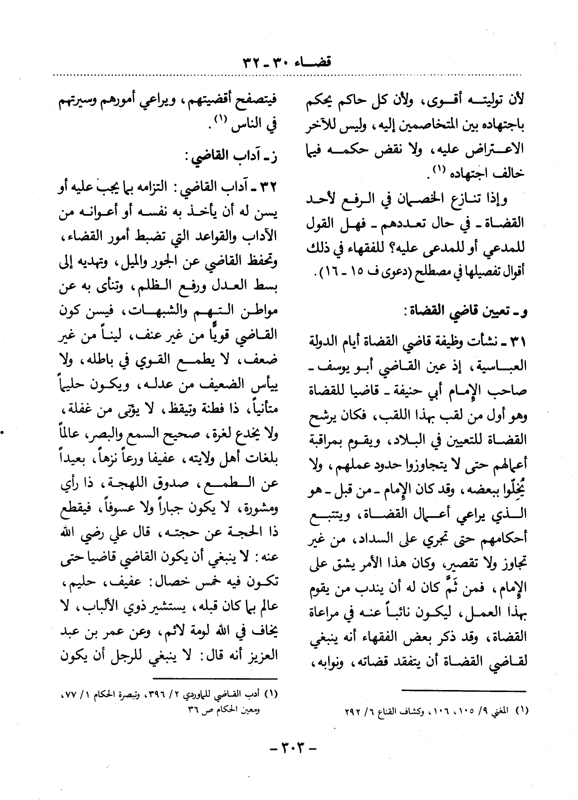 32 - آدَابُ الْقَاضِي: الْتِزَامُهُ بِمَا يَجِبُ عَلَيْهِ أَوْ يُسَنُّ لَهُ أَنْ يَأْخُذَ بِهِ نَفْسَهُ أَوْ أَعْوَانَهُ مِنَ الآْدَابِ وَالْقَوَاعِدِ الَّتِي تَضْبِطُ أُمُورَ الْقَضَاءِ، وَتَحْفَظُ الْقَاضِيَ عَنِ الْجَوْرِ وَالْمَيْل، وَتَهْدِيهِ إِلَى بَسْطِ الْعَدْل وَرَفْعِ الظُّلْمِ، وَتَنْأَى بِهِ عَنْ مَوَاطِنِ التُّهَمِ وَالشُّبُهَاتِ، فَيُسَنُّ كَوْنُ الْقَاضِي قَوِيًّا مِنْ غَيْرِ عُنْفٍ، لَيِّنًا مِنْ غَيْرِ ضَعْفٍ، لاَ يَطْمَعُ الْقَوِيُّ فِي بَاطِلِهِ، وَلاَ يَيْأَسُ الضَّعِيفُ مِنْ عَدْلِهِ، وَيَكُونُ حَلِيمًا مُتَأَنِّيًا، ذَا فِطْنَةٍ وَتَيَقُّظٍ، لاَ يُؤْتَى مِنْ غَفْلَةٍ، وَلاَ يُخْدَعُ لِغَرَّةٍ، صَحِيحَ السَّمْعِ وَالْبَصَرِ، عَالِمًا بِلُغَاتِ أَهْل وِلاَيَتِهِ، عَفِيفًا وَرِعًا نَزِهًا، بَعِيدًا عَنِ الطَّمَعِ، صَدُوقَ الْجِهَةِ، ذَا رَأْيٍ وَمَشُورَةٍ، لاَ يَكُونُ جَبَّارًا وَلاَ عَسُوفًا، فَيَقْطَعُ ذَا الْحُجَّةِ عَنْ حُجَّتِهِ، قَال عَلِيٌّ رَضِيَ اللَّهُ عَنْهُ: لاَ يَنْبَغِي أَنْ يَكُونَ الْقَاضِي قَاضِيًا حَتَّى تَكُونَ فِيهِ خَمْسُ خِصَالٍ: عَفِيفٌ، حَلِيمٌ، عَالِمٌ بِمَا كَانَ قَبْلَهُ، يَسْتَشِيرُ ذَوِي الأَْلْبَابِ، لاَ يَخَافُ فِي اللَّهِ لَوْمَةَ لاَئِمٍ، وَعَنْ عُمَرَ بْنِ عَبْدِ الْعَزِيزِ أَنَّهُ قَال: لاَ يَنْبَغِي لِلرَّجُل أَنْ يَكُونَ
