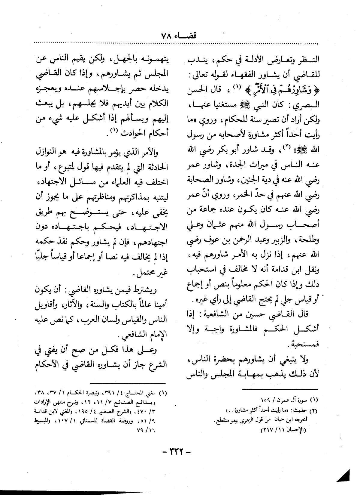 النَّظَرِ وَتَعَارُضِ الأَْدِلَّةِ فِي حُكْمٍ، يُنْدَبُ لِلْقَاضِي أَنْ يُشَاوِرَ الْفُقَهَاءَ لِقَوْلِهِ تَعَالَى: {وَشَاوِرْهُمْ فِي الأَْمْرِ} (1) ، قَال الْحَسَنُ الْبَصْرِيُّ: كَانَ النَّبِيُّ صَلَّى اللَّهُ عَلَيْهِ وَسَلَّمَ مُسْتَغْنِيًا عَنْهَا، وَلَكِنْ أَرَادَ أَنْ تَصِيرَ سُنَّةً لِلْحُكَّامِ، وَرُوِيَ مَا رَأَيْتُ أَحَدًا أَكْثَرَ مُشَاوَرَةً لأَِصْحَابِهِ مِنْ رَسُول اللَّهِ صَلَّى اللَّهُ عَلَيْهِ وَسَلَّمَ (2) ، وَقَدْ شَاوَرَ أَبُو بَكْرٍ رَضِيَ اللَّهُ عَنْهُ النَّاسَ فِي مِيرَاثِ الْجَدَّةِ، وَشَاوَرَ عُمَرُ رَضِيَ اللَّهُ عَنْهُ فِي دِيَةِ الْجَنِينِ، وَشَاوَرَ الصَّحَابَةَ رَضِيَ اللَّهُ عَنْهُمْ فِي حَدِّ الْخَمْرِ، وَرُوِيَ أَنَّ عُمَرَ رَضِيَ اللَّهُ عَنْهُ كَانَ يَكُونُ عِنْدَهُ جَمَاعَةٌ مِنْ أَصْحَابِ رَسُول اللَّهِ، مِنْهُمْ عُثْمَانُ وَعَلِيٌّ وَطَلْحَةُ، وَالزُّبَيْرُ وَعَبْدُ الرَّحْمَنِ بْنُ عَوْفٍ رَضِيَ اللَّهُ عَنْهُمْ، إِذَا نَزَل بِهِ الأَْمْرُ شَاوَرَهُمْ فِيهِ، وَنَقَل ابْنُ قُدَامَةَ أَنَّهُ لاَ مُخَالِفَ فِي اسْتِحْبَابِ ذَلِكَ وَإِذَا كَانَ الْحُكْمُ مَعْلُومًا بِنَصٍّ أَوْ إِجْمَاعٍ أَوْ قِيَاسٍ جَلِيٍّ لَمْ يَحْتَجِ الْقَاضِي إِلَى رَأْيِ غَيْرِهِ.
