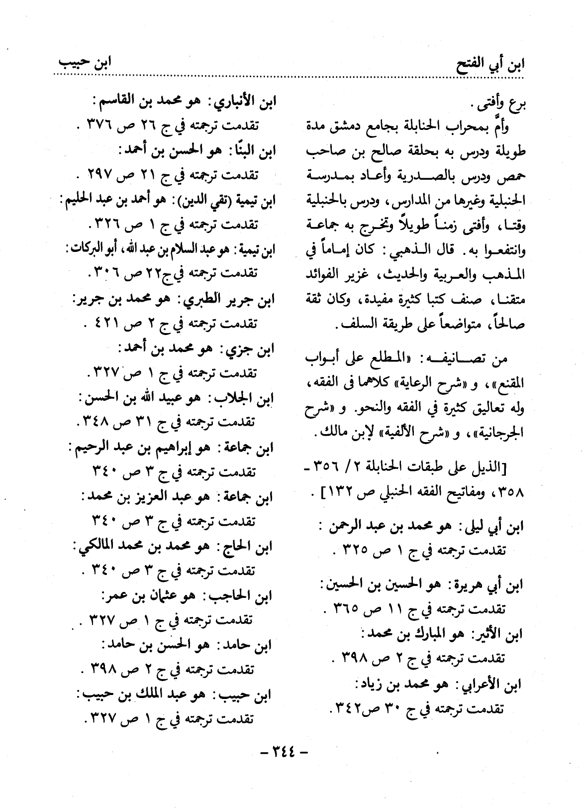 برع وأفتى. وأم بمحراب الحنابلة بجامع دمشق مدة طويلة ودرس به بحلقة صالح بن صاحب حمص ودرس بالصدرية وأعاد بمدرسة الحنبلية وغيرها من المدارس، ودرس بالحنبلية وقتا، وأفتى زمنا طويلا وتخرج به جماعة وانتفعوا به. قال الذهبي: كان إماما في المذهب والعربية والحديث، غزير الفوائد متقنا، صنف كتبا كثيرة مفيدة، وكان ثقة صالحا، متواضعا على طريقة السلف. من تصانيفه: " المطلع على أبواب المقنع "، و " شرح الرعاية " كلاهما في الفقه، وله تعاليق كثيرة في الفقه والنحو. و " شرح الجرجانية "، و " شرح الألفية " لابن مالك. [الذيل على طبقات الحنابلة 2 / 356 - 358، ومفاتيح الفقه الحنبلي ص 132] .