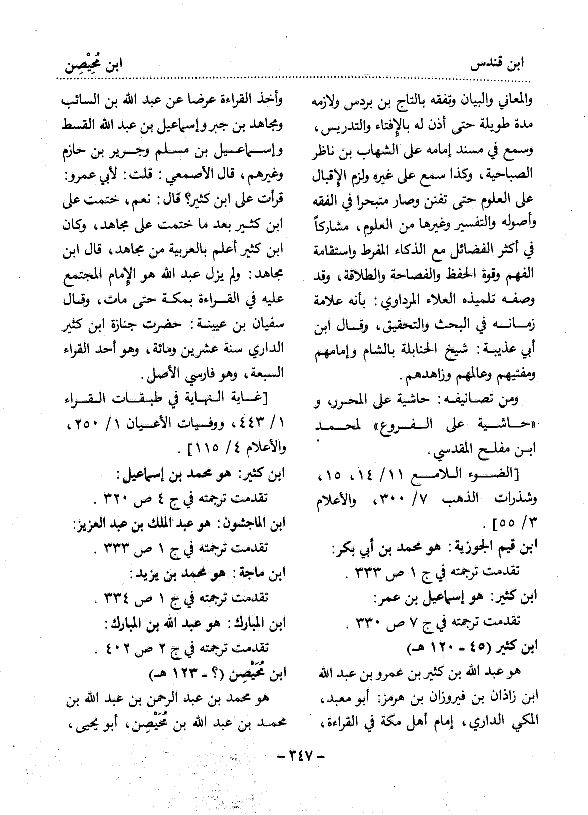 وأخذ القراءة عرضا عن عبد الله بن السائب ومجاهد بن جبر وإسماعيل بن عبد الله القسط وإسماعيل بن مسلم وجرير بن حازم وغيرهم، قال الأصمعي: قلت: لأبي عمرو: قرأت على ابن كثير؟ قال: نعم، ختمت على ابن كثير بعد ما ختمت على مجاهد، وكان ابن كثير أعلم بالعربية من مجاهد، قال ابن مجاهد: ولم يزل عبد الله هو الإمام المجتمع عليه في القراءة بمكة حتى مات، وقال سفيان بن عيينة: حضرت جنازة ابن كثير الداري سنة عشرين ومائة، وهو أحد القراء السبعة، وهو فارسي الأصل. [غاية النهاية في طبقات القراء 1 / 443، ووفيات الأعيان 1 / 250، والأعلام 4 / 115] .