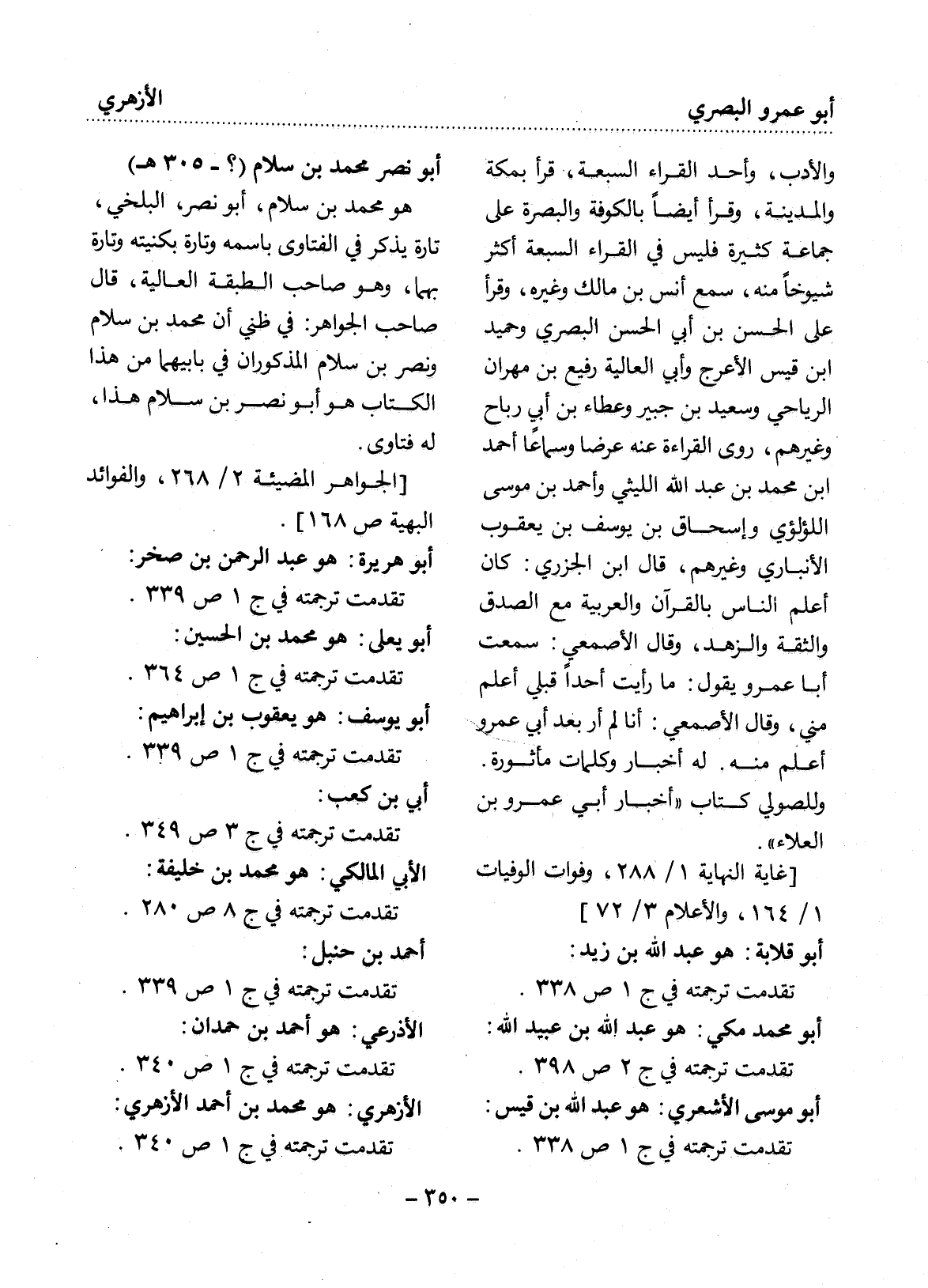 والأدب، وأحد القراء السبعة، قرأ بمكة والمدينة؟ ، وقرأ أيضا بالكوفة والبصرة على جماعة كثيرة فليس في القراء السبعة أكثر شيوخا منه، سمع أنس بن مالك وغيره، وقرأ على الحسن بن أبي الحسن البصري وحميد بن قيس الأعرج وأبي العالية رفيع بن مهران الرياحي وسعيد بن جبير وعطاء بن أبي رباح وغيرهم، روى القراءة عنه عرضا وسماعا أحمد بن محمد بن عبد الله الليثي وأحمد بن موسى اللؤلؤي وإسحاق بن يوسف بن يعقوب الأنباري وغيرهم، قال ابن الجزري: كان أعلم الناس بالقرآن والعربية مع الصدق والثقة والزهد، وقال الأصمعي: سمعت أبا عمرو يقول: ما رأيت أحد قبلي أعلم مني، وقال الأصمعي أنا لم أر بعد أبي عمرو أعلم منه. له أخبار وكلمات مأثورة. وللصولي كتاب " أخبار أبي عمرو بن العلاء " [غاية النهاية 1 / 288، وفوات الوفيات 1 / 164، والأعلام 3 / 72]