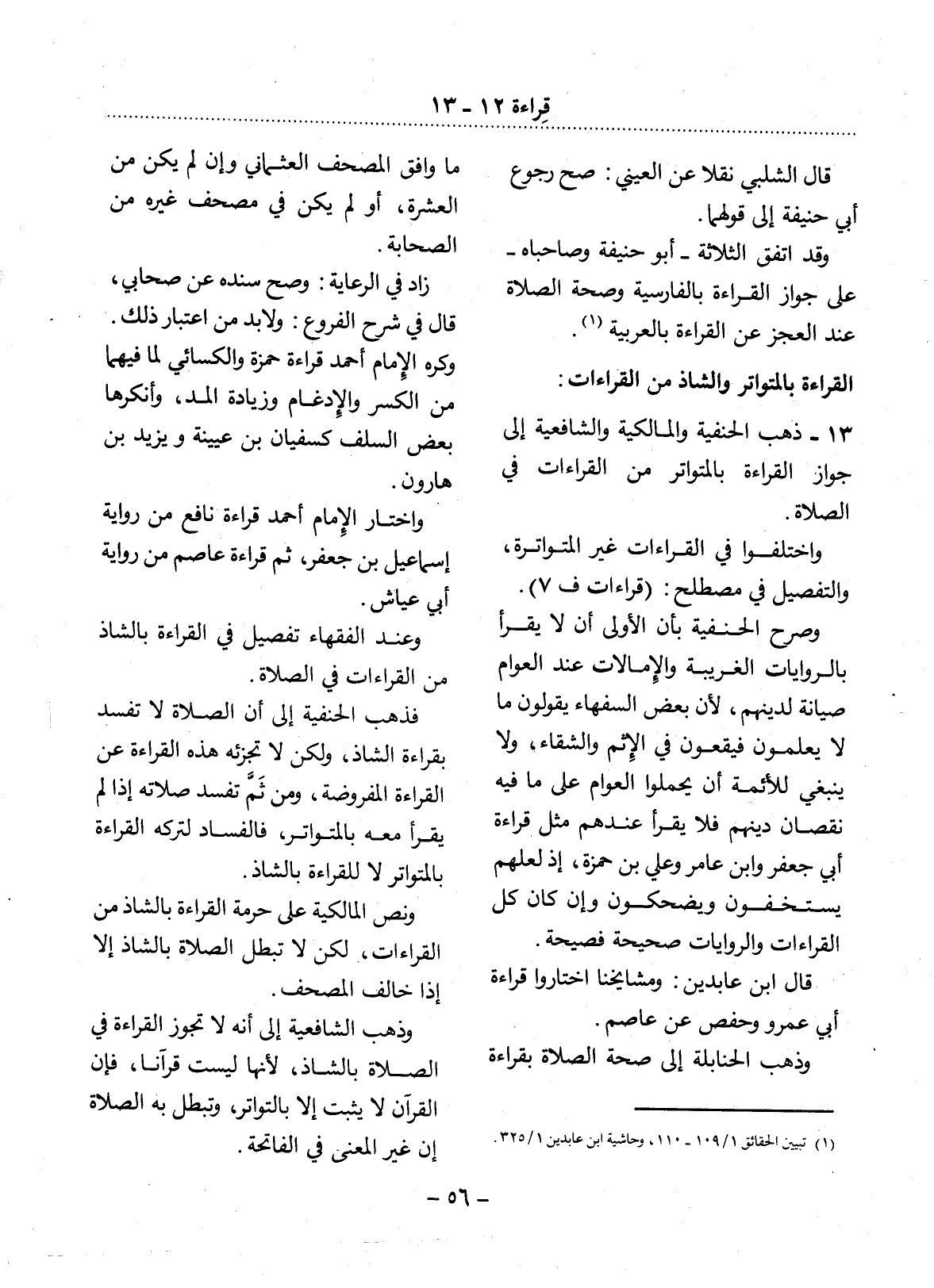 13 - ذَهَبَ الْحَنَفِيَّةُ وَالْمَالِكِيَّةُ وَالشَّافِعِيَّةُ إِلَى جَوَازِ الْقِرَاءَةِ بِالْمُتَوَاتِرِ مِنَ الْقِرَاءَاتِ فِي الصَّلاَةِ.