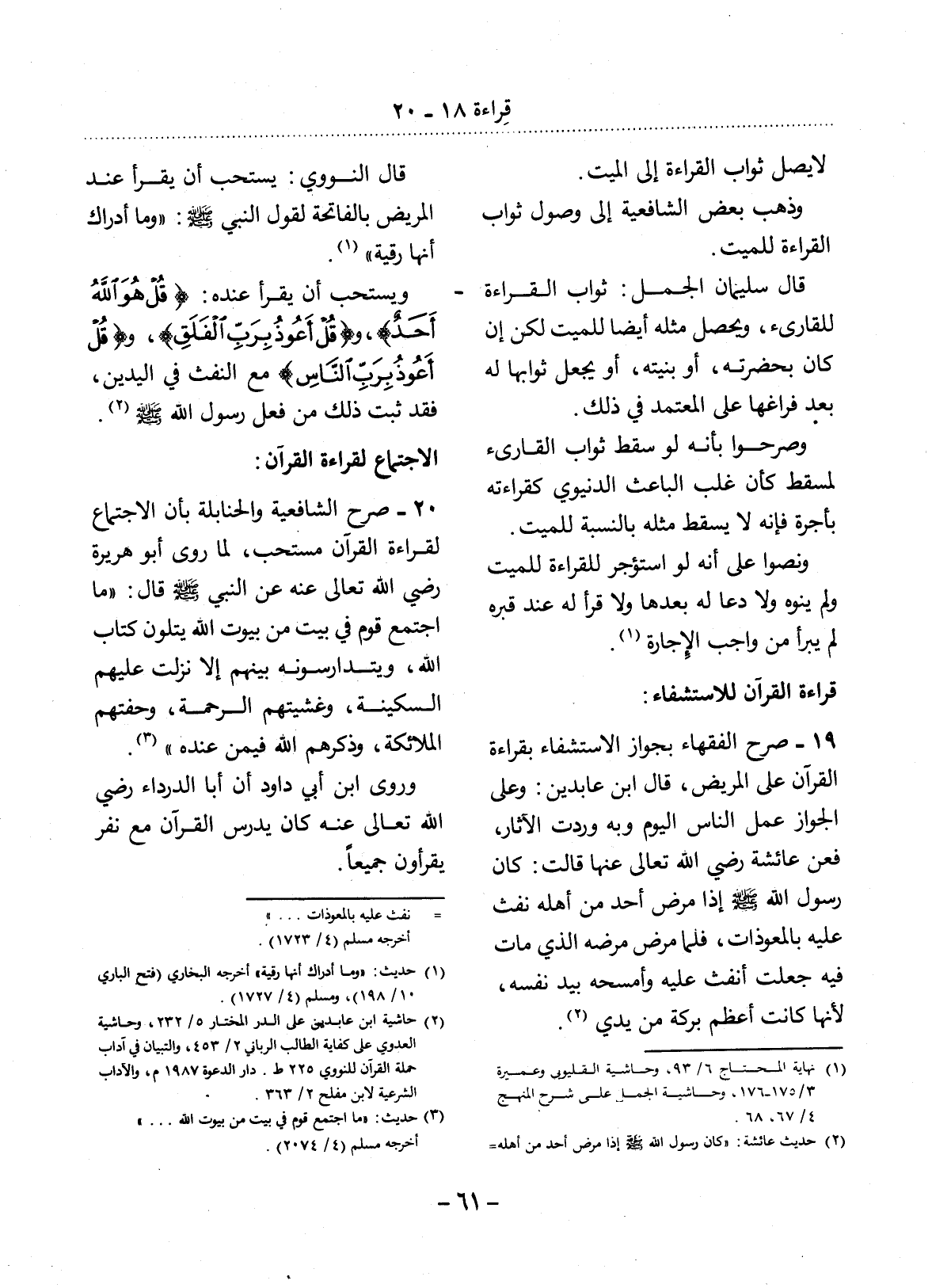 19 - صَرَّحَ الْفُقَهَاءُ بِجَوَازِ الاِسْتِشْفَاءِ بِقِرَاءَةِ الْقُرْآنِ عَلَى الْمَرِيضِ، قَال ابْنُ عَابِدِينَ: وَعَلَى الْجَوَازِ عَمَل النَّاسِ الْيَوْمَ وَبِهِ وَرَدَتِ الآْثَارُ، فَعَنْ عَائِشَةَ رَضِيَ اللَّهُ تَعَالَى عَنْهَا قَالَتْ: كَانَ رَسُول اللَّهِ صَلَّى اللَّهُ عَلَيْهِ وَسَلَّمَ إِذَا مَرِضَ أَحَدٌ مِنْ أَهْلِهِ نَفَثَ عَلَيْهِ بِالْمُعَوِّذَاتِ، فَلَمَّا مَرِضَ مَرَضَهُ الَّذِي مَاتَ فِيهِ جَعَلْتُ أَنْفُثُ عَلَيْهِ وَأَمْسَحُهُ بِيَدِ نَفْسِهِ؛ لأَِنَّهَا كَانَتْ أَعْظَمَ بَرَكَةً مِنْ يَدِي.