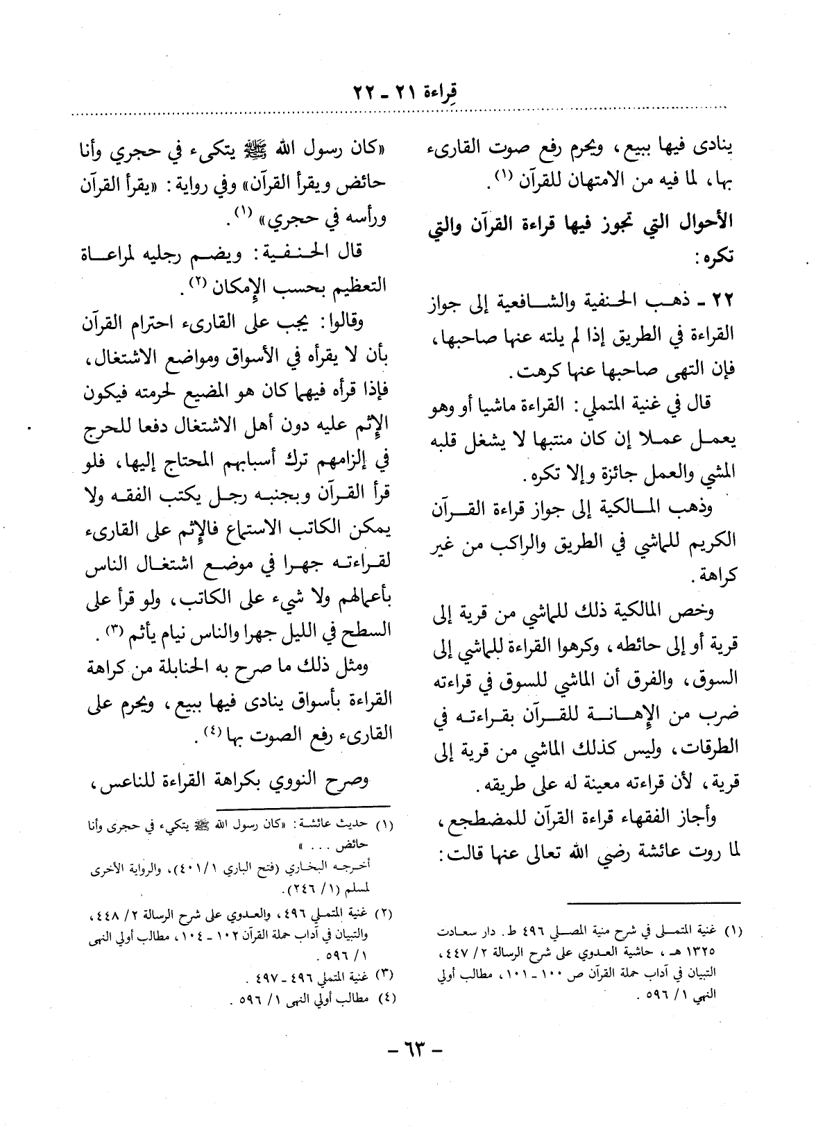 (1) غنية المتملي في شرح منية المصلي 496 ط. دار سعادت 1325 هـ، حاشية العدوي على شرح الرسالة 2 / 447، التبيان في آداب حملة القرآن ص 100 - 101، مطالب أولي النهى 1 / 596.