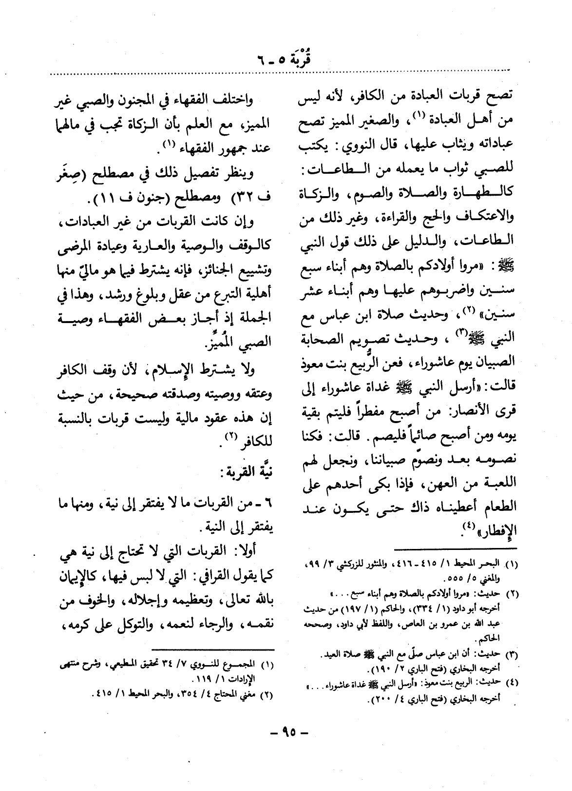 6 - مِنَ الْقُرُبَاتِ مَا لاَ يَفْتَقِرُ إِلَى نِيَّةٍ، وَمِنْهَا مَا يَفْتَقِرُ إِلَى النِّيَّةِ.