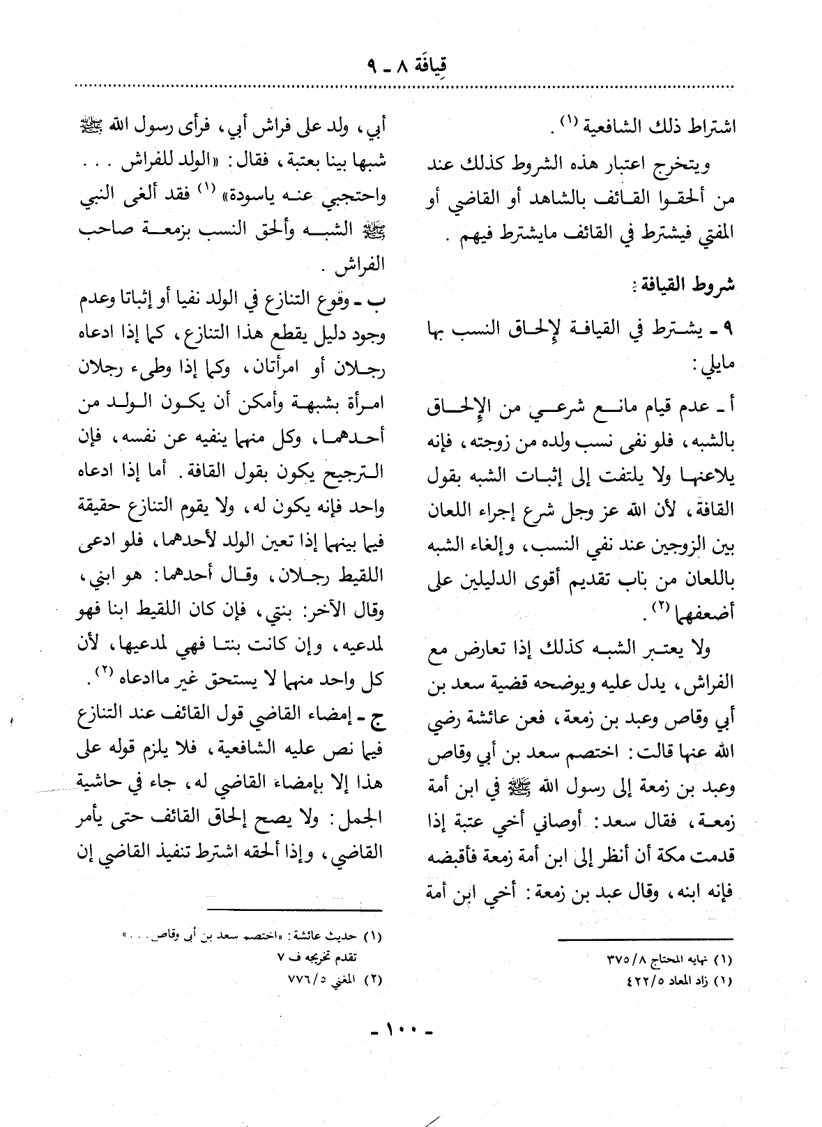 9 - يُشْتَرَطُ فِي الْقِيَافَةِ لإِِلْحَاقِ النَّسَبِ بِهَا مَا يَلِي: