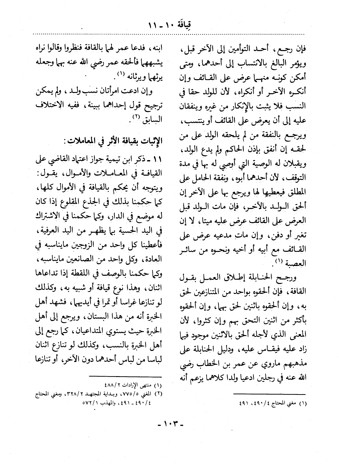 ابْنُهُ، فَدَعَا عُمَرُ لَهُمَا بِالْقَافَةِ فَنَظَرُوا وَقَالُوا نَرَاهُ يُشْبِهُهُمَا فَأَلْحَقَهُ عُمَرُ رَضِيَ اللَّهُ عَنْهُ بِهِمَا وَجَعَلَهُ يَرِثُهُمَا وَيَرِثَانِهِ (1) .