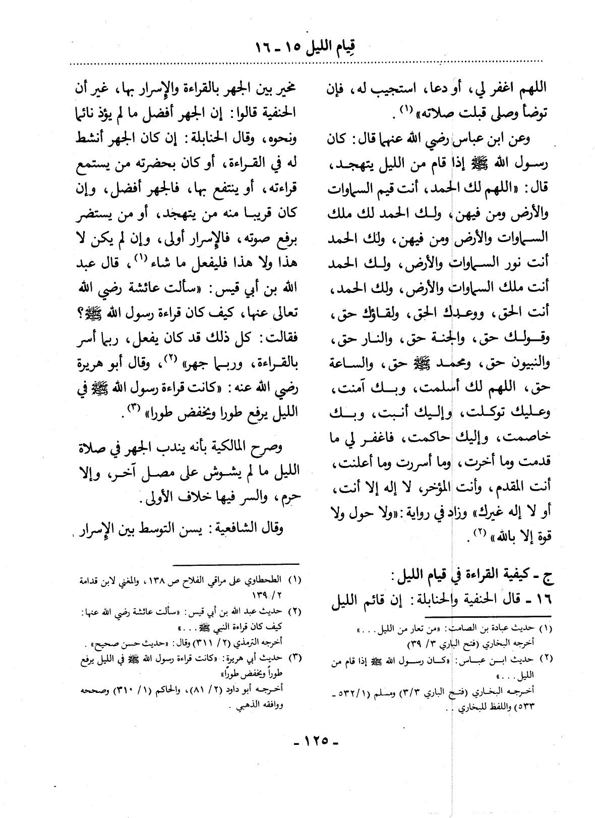 وَعَنِ ابْنِ عَبَّاسٍ رَضِيَ اللَّهُ عَنْهُمَا قَال: كَانَ رَسُول اللَّهِ صَلَّى اللَّهُ عَلَيْهِ وَسَلَّمَ إِذَا قَامَ مِنَ اللَّيْل يَتَهَجَّدُ، قَال: اللَّهُمَّ لَكَ الْحَمْدُ، أَنْتَ قَيِّمُ السَّمَاوَاتِ وَالأَْرْضِ وَمَنْ فِيهِنَّ، وَلَكَ الْحَمْدُ لَكَ مُلْكُ السَّمَاوَاتِ وَالأَْرْضِ وَمَنْ فِيهِنَّ، وَلَكَ الْحَمْدُ أَنْتَ نُورُ السَّمَاوَاتِ وَالأَْرْضِ، وَلَكَ الْحَمْدُ أَنْتَ مَلِكُ السَّمَاوَاتِ وَالأَْرْضِ، وَلَكَ الْحَمْدُ، أَنْتَ الْحَقُّ، وَوَعْدُكَ الْحَقُّ، وَلِقَاؤُكَ حَقٌّ، وَقَوْلُكَ حَقٌّ، وَالْجَنَّةُ حَقٌّ، وَالنَّارُ حَقٌّ، وَالنَّبِيُّونَ حَقٌّ، وَمُحَمَّدٌ صَلَّى اللَّهُ عَلَيْهِ وَسَلَّمَ حَقٌّ، وَالسَّاعَةُ حَقٌّ، اللَّهُمَّ لَكَ أَسْلَمْتُ، وَبِكَ آمَنْتُ، وَعَلَيْكَ تَوَكَّلْتُ، وَإِلَيْكَ أَنَبْتُ، وَبِكَ خَاصَمْتُ، وَإِلَيْكَ حَاكَمْتُ، فَاغْفِرْ لِي مَا قَدَّمْتُ وَمَا أَخَّرْتُ، وَمَا أَسْرَرْتُ وَمَا أَعْلَنْتُ، أَنْتَ الْمُقَدِّمُ، وَأَنْتَ الْمُؤَخِّرُ، لاَ إِلَهَ إِلاَّ أَنْتَ، أَوْ لاَ إِلَهَ غَيْرُكَ وَزَادَ فِي رِوَايَةٍ: " وَلاَ حَوْل وَلاَ قُوَّةَ إِلاَّ بِاللَّهِ (2) ".