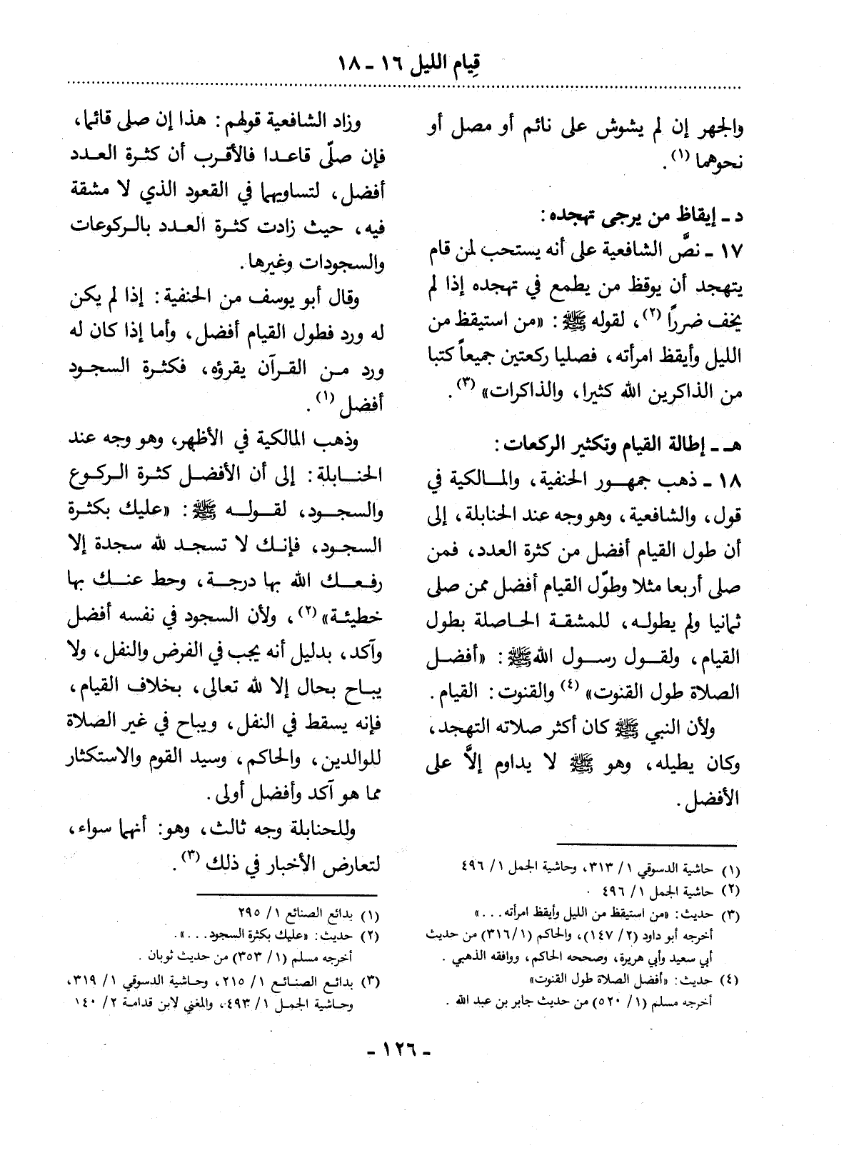 18 - ذَهَبَ جُمْهُورُ الْحَنَفِيَّةِ، وَالْمَالِكِيَّةِ فِي قَوْلٍ، وَالشَّافِعِيَّةُ، وَهُوَ وَجْهٌ عِنْدَ الْحَنَابِلَةِ، إِلَى أَنَّ طُول الْقِيَامِ أَفْضَل مِنْ كَثْرَةِ الْعَدَدِ، فَمَنْ صَلَّى أَرْبَعًا مَثَلاً وَطَوَّل الْقِيَامَ أَفْضَل مِمَّنْ صَلَّى ثَمَانِيًا وَلَمْ يُطَوِّلْهُ، لِلْمَشَقَّةِ الْحَاصِلَةِ بِطُول الْقِيَامِ، وَلِقَوْل رَسُول اللَّهِ صَلَّى اللَّهُ عَلَيْهِ وَسَلَّمَ: أَفْضَل الصَّلاَةِ طُول الْقُنُوتِ (4) وَالْقُنُوتُ: الْقِيَامُ.