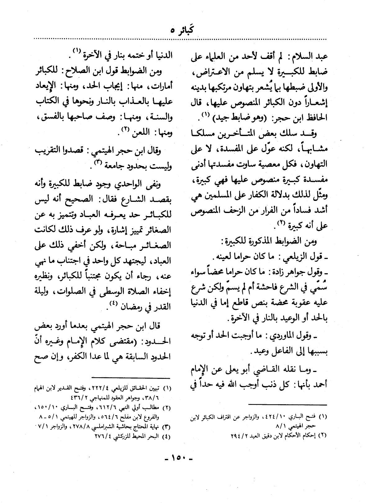 الْعِزُّ بْنُ عَبْدِ السَّلاَمِ: لَمْ أَقِفْ لأَِحَدٍ مِنَ الْعُلَمَاءِ عَلَى ضَابِطٍ لِلْكَبِيرَةِ لاَ يَسْلَمُ مِنَ الاِعْتِرَاضِ، وَالأَْوْلَى ضَبْطُهَا بِمَا يُشْعِرُ بِتَهَاوُنِ مُرْتَكِبِهَا بِدِينِهِ إِشْعَارًا دُونَ الْكَبَائِرِ الْمَنْصُوصِ عَلَيْهَا، قَال الْحَافِظُ ابْنُ حَجَرٍ: (وَهُوَ ضَابِطٌ جَيِّدٌ (1)) .