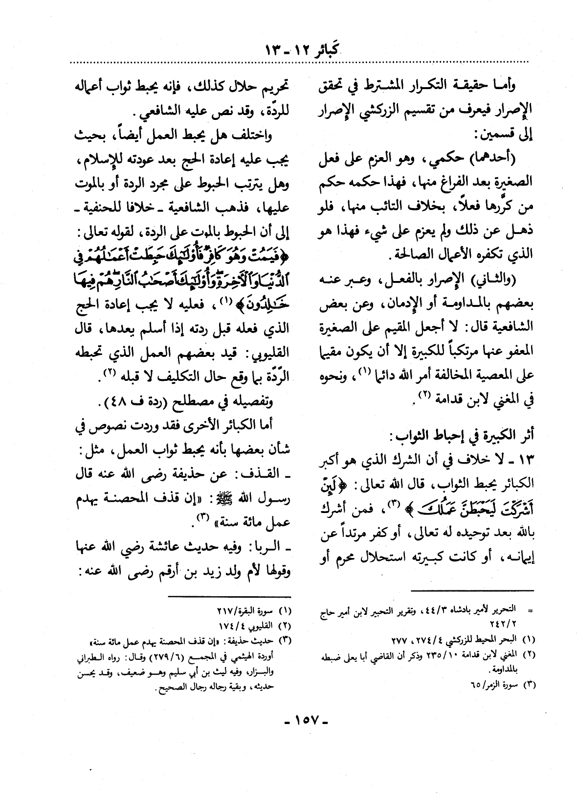 13 - لاَ خِلاَفَ فِي أَنَّ الشِّرْكَ الَّذِي هُوَ أَكْبَرُ الْكَبَائِرِ يُحْبِطُ الثَّوَابَ، قَال اللَّهُ تَعَالَى: {لَئِنْ أَشْرَكْتَ لَيَحْبَطَنَّ عَمَلُكَ} ، فَمَنْ أَشْرَكَ بِاللَّهِ بَعْدَ تَوْحِيدِهِ لَهُ تَعَالَى، أَوْ كَفَرَ مُرْتَدًّا عَنْ إِيمَانِهِ، أَوْ كَانَتْ كَبِيرَتُهُ اسْتِحْلاَل مُحَرَّمٍ أَوْ