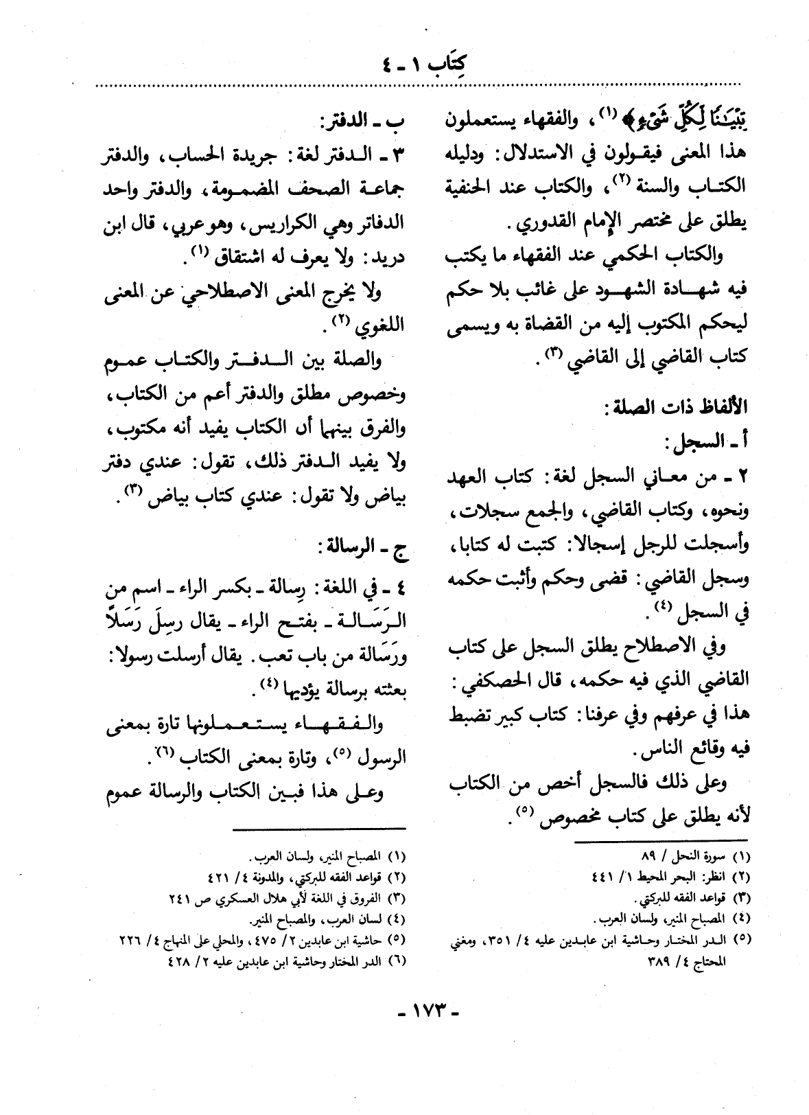 تِبْيَانًا لِكُل شَيْءٍ} ، وَالْفُقَهَاءُ يَسْتَعْمِلُونَ هَذَا الْمَعْنَى فَيَقُولُونَ فِي الاِسْتِدْلاَل: وَدَلِيلُهُ الْكِتَابُ وَالسُّنَّةُ (1) ، وَالْكِتَابُ عِنْدَ الْحَنَفِيَّةِ يُطْلَقُ عَلَى مُخْتَصَرِ الإِْمَامِ الْقُدُورِيِّ.