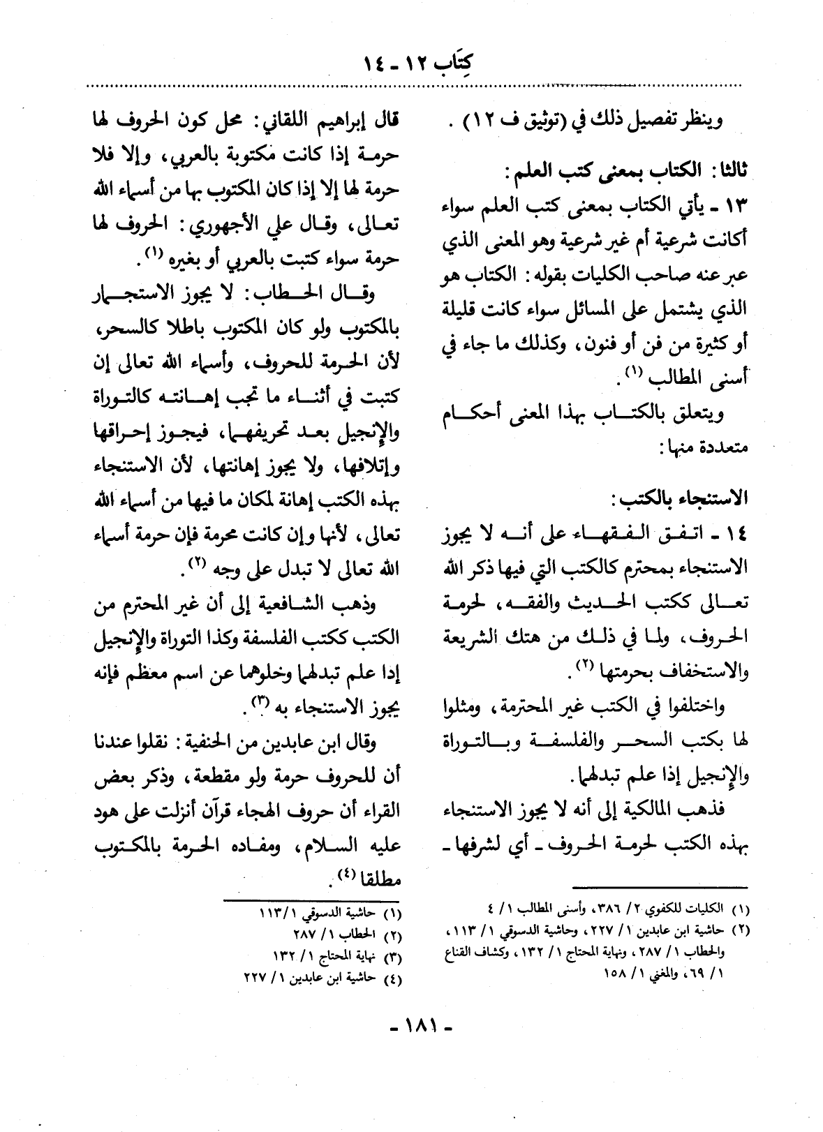 13 - يَأْتِي الْكِتَابُ بِمَعْنَى كُتُبِ الْعِلْمِ سَوَاءٌ أَكَانَتْ شَرْعِيَّةً أَمْ غَيْرَ شَرْعِيَّةٍ وَهُوَ الْمَعْنَى الَّذِي عَبَّرَ عَنْهُ صَاحِبُ الْكُلِّيَّاتِ بِقَوْلِهِ: الْكِتَابُ هُوَ الَّذِي يَشْتَمِل عَلَى الْمَسَائِل سَوَاءٌ كَانَتْ قَلِيلَةً أَوْ كَثِيرَةً مِنْ فَنٍّ أَوْ فُنُونٍ، وَكَذَلِكَ مَا جَاءَ فِي أَسْنَى الْمَطَالِبِ (1) .