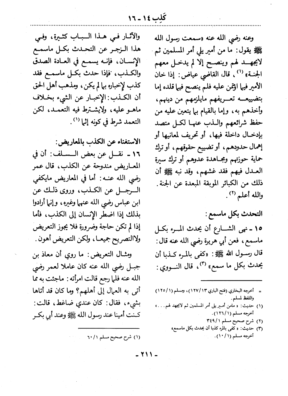 15 - نَهَى الشَّارِعُ أَنْ يُحَدِّثَ الْمَرْءُ بِكُل مَا سَمِعَ، فَعَنْ أَبِي هُرَيْرَةَ رَضِيَ اللَّهُ عَنْهُ قَال: قَال رَسُول اللَّهِ صَلَّى اللَّهُ عَلَيْهِ وَسَلَّمَ: كَفَى بِالْمَرْءِ كَذِبًا أَنْ يُحَدِّثَ بِكُل مَا سَمِعَ (3) ، قَال النَّوَوِيُّ: