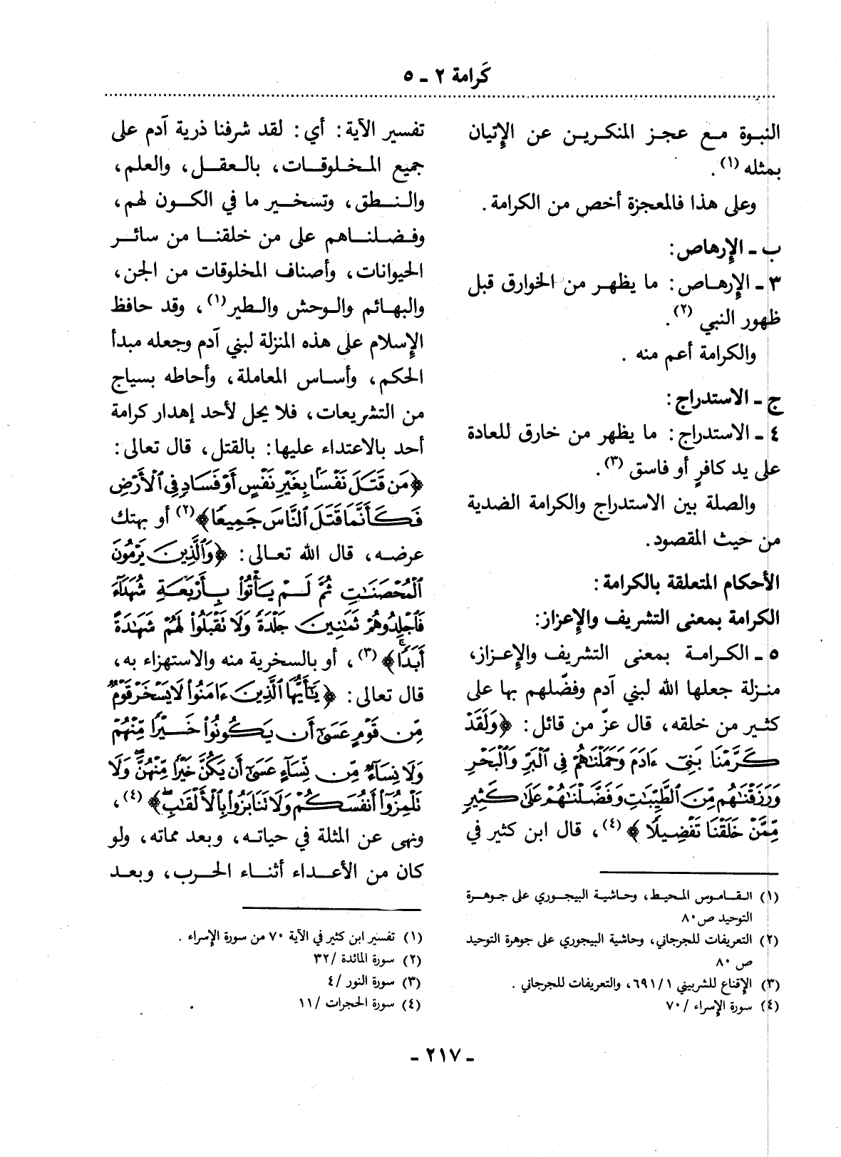 5 - الْكَرَامَةُ بِمَعْنَى التَّشْرِيفِ وَالإِْعْزَازِ، مَنْزِلَةٌ جَعَلَهَا اللَّهُ لِبَنِي آدَمَ وَفَضَّلَهُمْ بِهَا عَلَى كَثِيرٍ مِنْ خَلْقِهِ، قَال عَزَّ مَنْ قَائِلٌ: {وَلَقَدْ كَرَّمْنَا بَنِي آدَمَ وَحَمَلْنَاهُمْ فِي الْبَرِّ وَالْبَحْرِ وَرَزَقْنَاهُمْ مِنَ الطَّيِّبَاتِ وَفَضَّلْنَاهُمْ عَلَى كَثِيرٍ مِمَّنْ خَلَقْنَا تَفْضِيلاً} (4) ، قَال ابْنُ كَثِيرٍ فِي