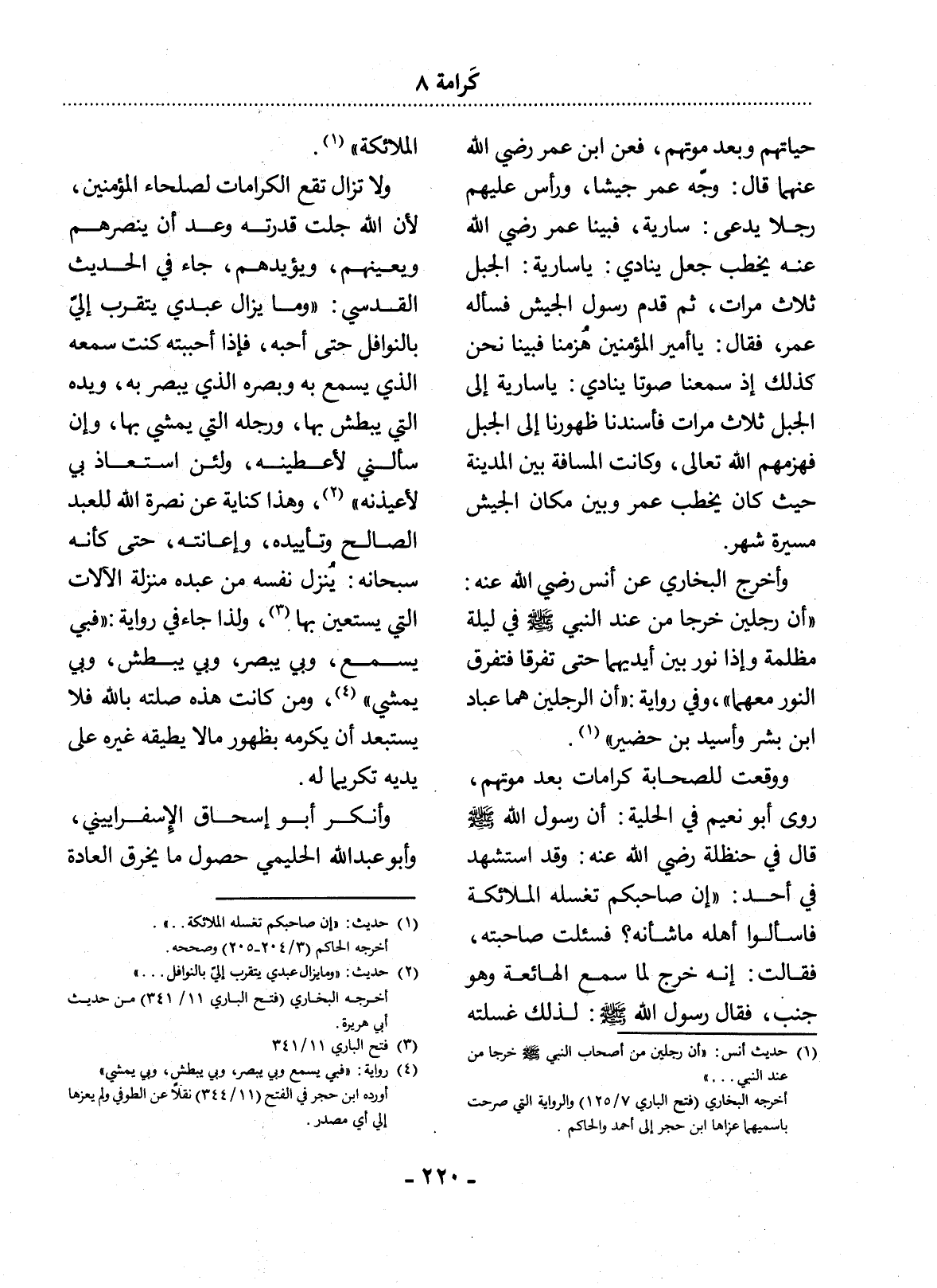 وَأَخْرَجَ الْبُخَارِيُّ عَنْ أَنَسٍ رَضِيَ اللَّهُ عَنْهُ: " أَنَّ رَجُلَيْنِ خَرَجَا مِنْ عِنْدِ النَّبِيِّ صَلَّى اللَّهُ عَلَيْهِ وَسَلَّمَ فِي لَيْلَةٍ مُظْلِمَةٍ وَإِذَا نُورٌ بَيْنَ أَيْدِيهِمَا حَتَّى تَفَرَّقَا فَتَفَرَّقَ النُّورُ مَعَهُمَا، وَفِي رِوَايَةٍ: " أَنَّ الرَّجُلَيْنِ هُمَا عَبَّادُ بْنُ بِشْرٍ وَأُسَيْدُ بْنُ حُضَيْرٍ " (1) .