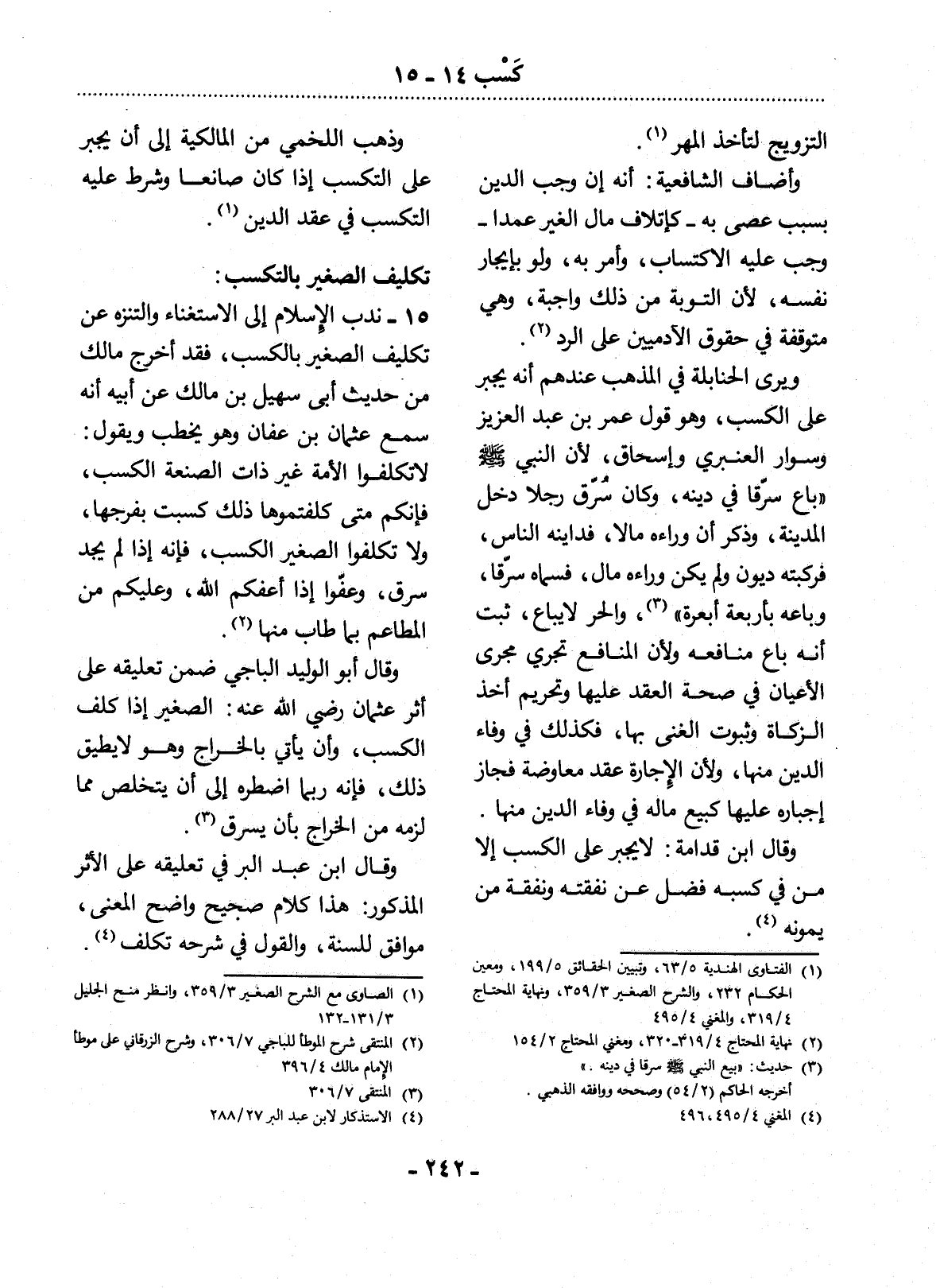15 - نَدَبَ الإِْسْلاَمُ إِلَى الاِسْتِغْنَاءِ وَالتَّنَزُّهِ عَنْ تَكْلِيفِ الصَّغِيرِ بِالْكَسْبِ، فَقَدْ أَخْرَجَ مَالِكٌ مِنْ حَدِيثِ أَبِي سُهَيْل بْنِ مَالِكٍ عَنْ أَبِيهِ أَنَّهُ سَمِعَ عُثْمَانَ بْنَ عَفَّانَ وَهُوَ يَخْطُبُ وَيَقُول: لاَ تُكَلِّفُوا الأَْمَةَ غَيْرَ ذَاتِ الصَّنْعَةِ الْكَسْبَ، فَإِنَّكُمْ مَتَى كَلَّفْتُمُوهَا ذَلِكَ كَسَبَتْ بِفَرْجِهَا، وَلاَ تُكَلِّفُوا الصَّغِيرَ الْكَسْبَ، فَإِنَّهُ إِذَا لَمْ يَجِدْ سَرَقَ، وَعُفُّوا إِذَا أَعَفَّكُمُ اللَّهُ، وَعَلَيْكُمْ مِنَ الْمَطَاعِمِ بِمَا طَابَ مِنْهَا (2) .
