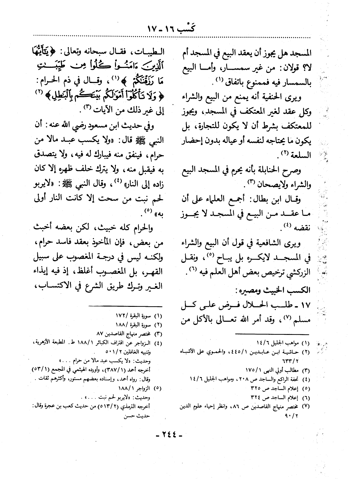 (4) الزواجر عن اقتراف الكبائر 1 / 188 ط. المطبعة الأزهرية، وتنبيه الغافلين 2 / 501 وحديث: " لا يكسب عبد مالاً من حرام. . . " أخرجه أحمد (1 / 387) ، وأورده الهيثمي في المجمع (1 / 53) وقال: رواه أحمد، وإسناده بعضهم مستور، وأكثرهم ثقات.