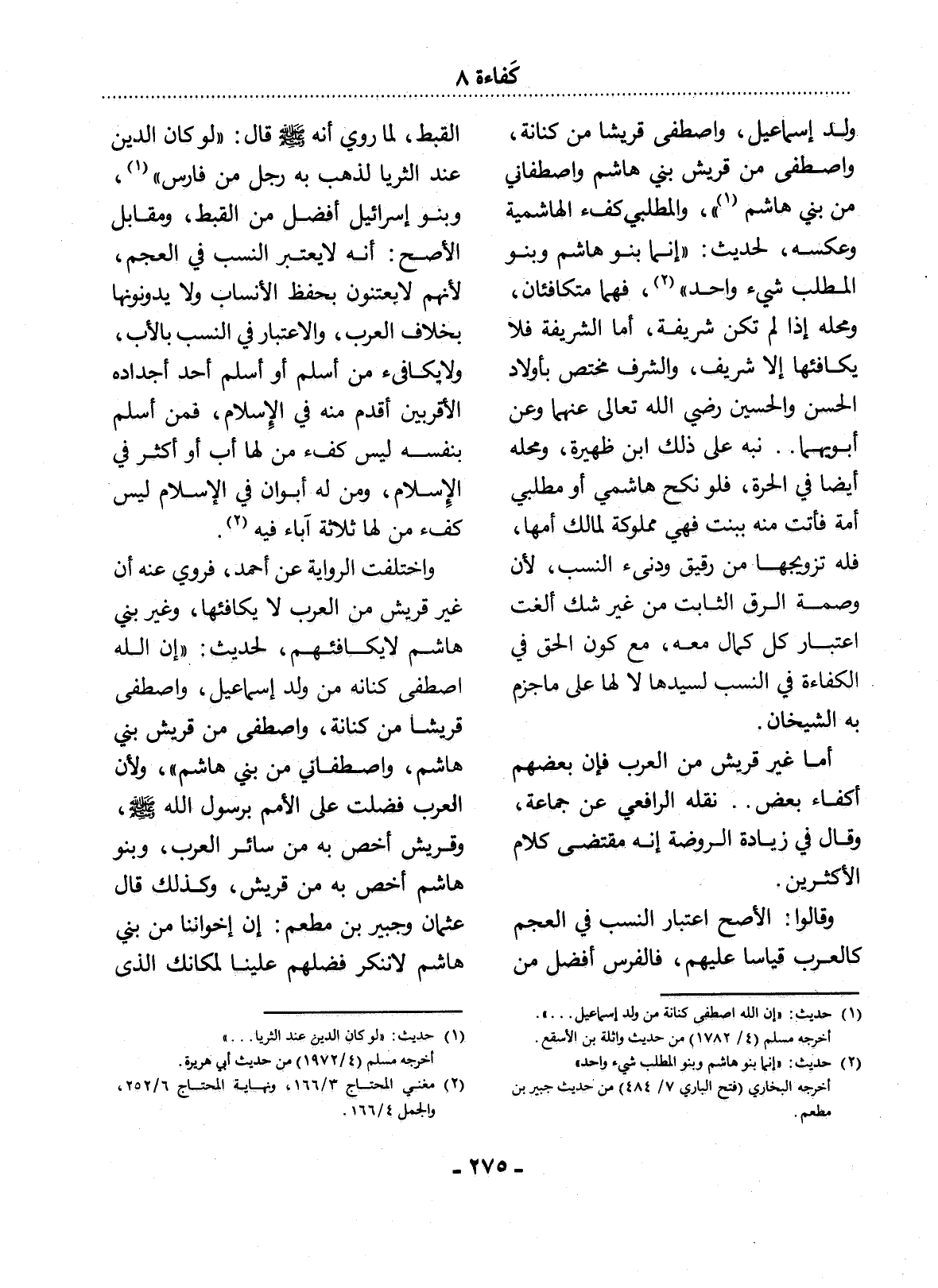 وَلَدِ إِسْمَاعِيل، وَاصْطَفَى قُرَيْشًا مِنْ كِنَانَةَ، وَاصْطَفَى مِنْ قُرَيْشٍ بَنِي هَاشِمٍ وَاصْطَفَانِي مِنْ بَنِي هَاشِمٍ (1) ، وَالْمُطَّلِبِيُّ كُفْءُ الْهَاشِمِيَّةِ وَعَكْسُهُ، لِحَدِيثِ: إِنَّمَا بَنُو هَاشِمٍ وَبَنُو الْمُطَّلِبِ شَيْءٌ وَاحِدٌ (2) ، فَهُمَا مُتَكَافِئَانِ، وَمَحَلُّهُ إِذَا لَمْ تَكُنْ شَرِيفَةً، أَمَّا الشَّرِيفَةُ فَلاَ يُكَافِئُهَا إِلاَّ شَرِيفٌ، وَالشَّرَفُ مُخْتَصٌّ بِأَوْلاَدِ الْحَسَنِ وَالْحُسَيْنِ رَضِيَ اللَّهُ تَعَالَى عَنْهُمَا وَعَنْ أَبَوَيْهِمَا. . نَبَّهَ عَلَى ذَلِكَ ابْنُ ظَهِيرَةَ، وَمَحَلُّهُ أَيْضًا فِي الْحُرَّةِ، فَلَوْ نَكَحَ هَاشِمِيٌّ أَوْ مُطَّلِبِيٌّ أَمَةً فَأَتَتْ مِنْهُ بِبِنْتٍ فَهِيَ مَمْلُوكَةٌ لِمَالِكِ أُمِّهَا، فَلَهُ تَزْوِيجُهَا مِنْ رَقِيقٍ وَدَنِيءِ النَّسَبِ، لأَِنَّ وَصْمَةَ الرِّقِّ الثَّابِتِ مِنْ غَيْرِ شَكٍّ أَلْغَتِ اعْتِبَارَ كُل كَمَالٍ مَعَهُ، مَعَ كَوْنِ الْحَقِّ فِي الْكَفَاءَةِ فِي النَّسَبِ لِسَيِّدِهَا لاَ لَهَا عَلَى مَا جَزَمَ بِهِ الشَّيْخَانِ.