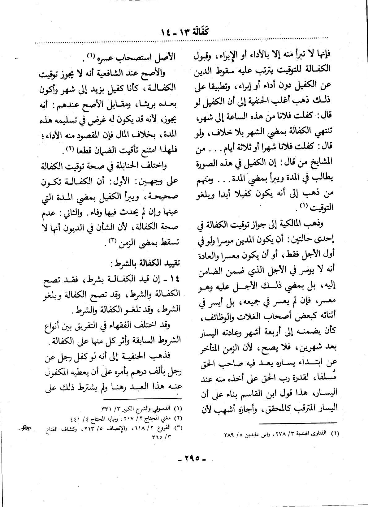 14 - إِنْ قَيَّدَ الْكَفَالَةَ بِشَرْطٍ، فَقَدْ تَصِحُّ الْكَفَالَةُ وَالشَّرْطُ، وَقَدْ تَصِحُّ الْكَفَالَةُ وَيَلْغُو الشَّرْطُ، وَقَدْ تَلْغُو الْكَفَالَةُ وَالشَّرْطُ.