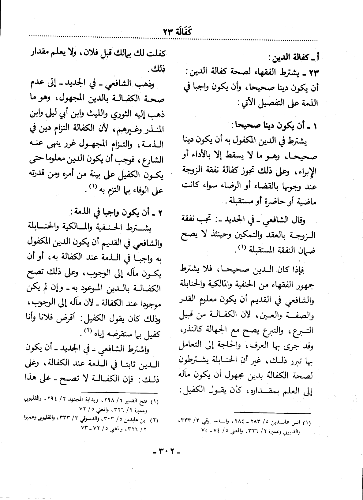 23 - يَشْتَرِطُ الْفُقَهَاءُ لِصِحَّةِ كَفَالَةِ الدَّيْنِ: أَنْ يَكُونَ دَيْنًا صَحِيحًا، وَأَنْ يَكُونَ وَاجِبًا فِي الذِّمَّةِ عَلَى التَّفْصِيل الآْتِي: