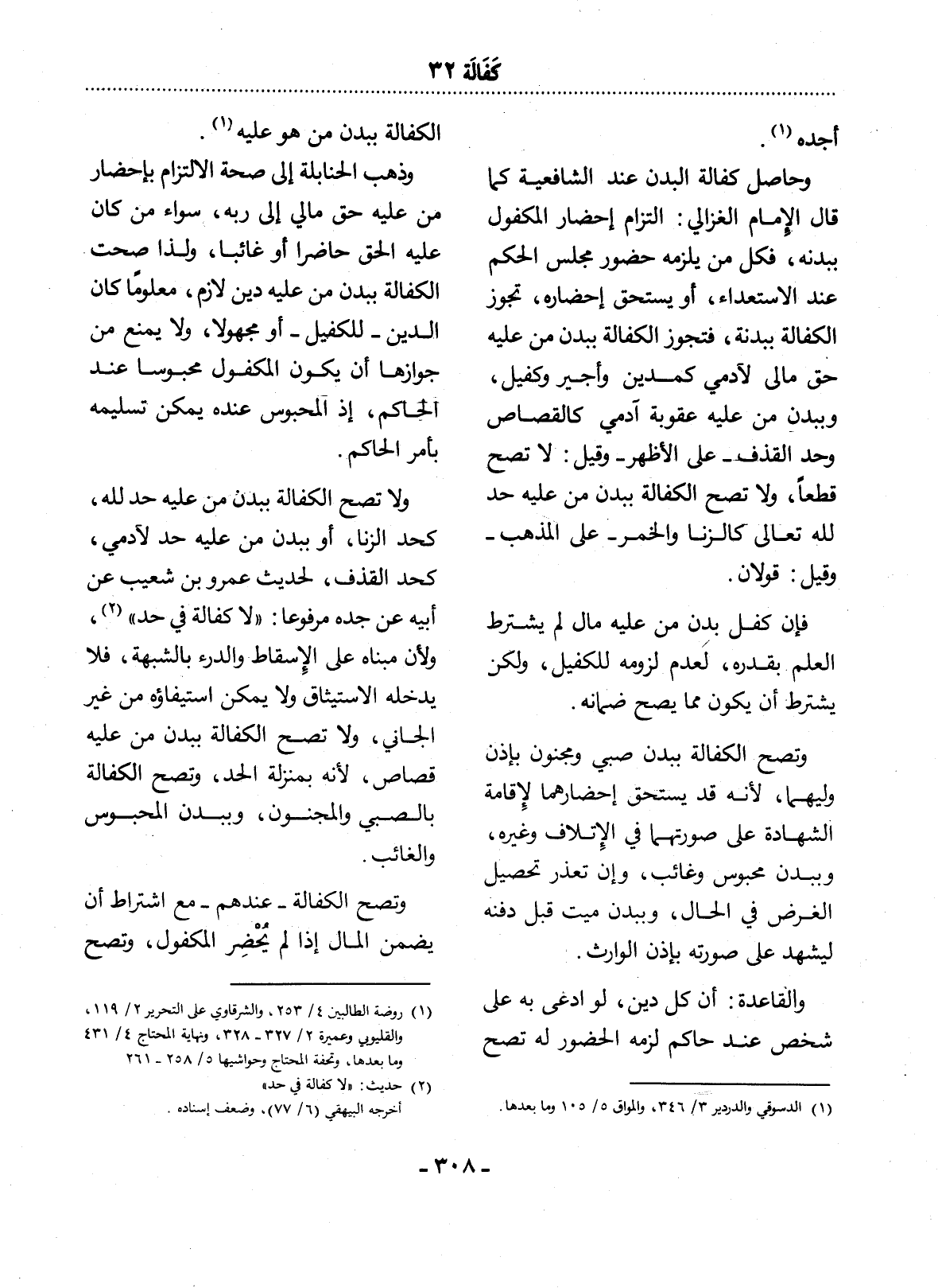 وَلاَ تَصِحُّ الْكَفَالَةُ بِبَدَنِ مَنْ عَلَيْهِ حَدٌّ لِلَّهِ، - كَحَدِّ الزِّنَا، أَوْ بِبَدَنِ مَنْ عَلَيْهِ حَدٌّ لآِدَمِيٍّ، كَحَدِّ الْقَذْفِ، لِحَدِيثِ عَمْرِو بْنِ شُعَيْبٍ عَنْ أَبِيهِ عَنْ جَدِّهِ مَرْفُوعًا: لاَ كَفَالَةَ فِي حَدٍّ (2) ؛ وَلأَِنَّ مَبْنَاهُ عَلَى الإِْسْقَاطِ وَالدَّرْءِ بِالشُّبْهَةِ، فَلاَ يَدْخُلُهُ الاِسْتِيثَاقُ وَلاَ يُمْكِنُ اسْتِيفَاؤُهُ مِنْ غَيْرِ الْجَانِي، وَلاَ تَصِحُّ الْكَفَالَةُ بِبَدَنِ مَنْ عَلَيْهِ قِصَاصٌ؛ لأَِنَّهُ بِمَنْزِلَةِ الْحَدِّ، وَتَصِحُّ الْكَفَالَةُ بِالصَّبِيِّ وَالْمَجْنُونِ، وَبِبَدَنِ الْمَحْبُوسِ وَالْغَائِبِ.