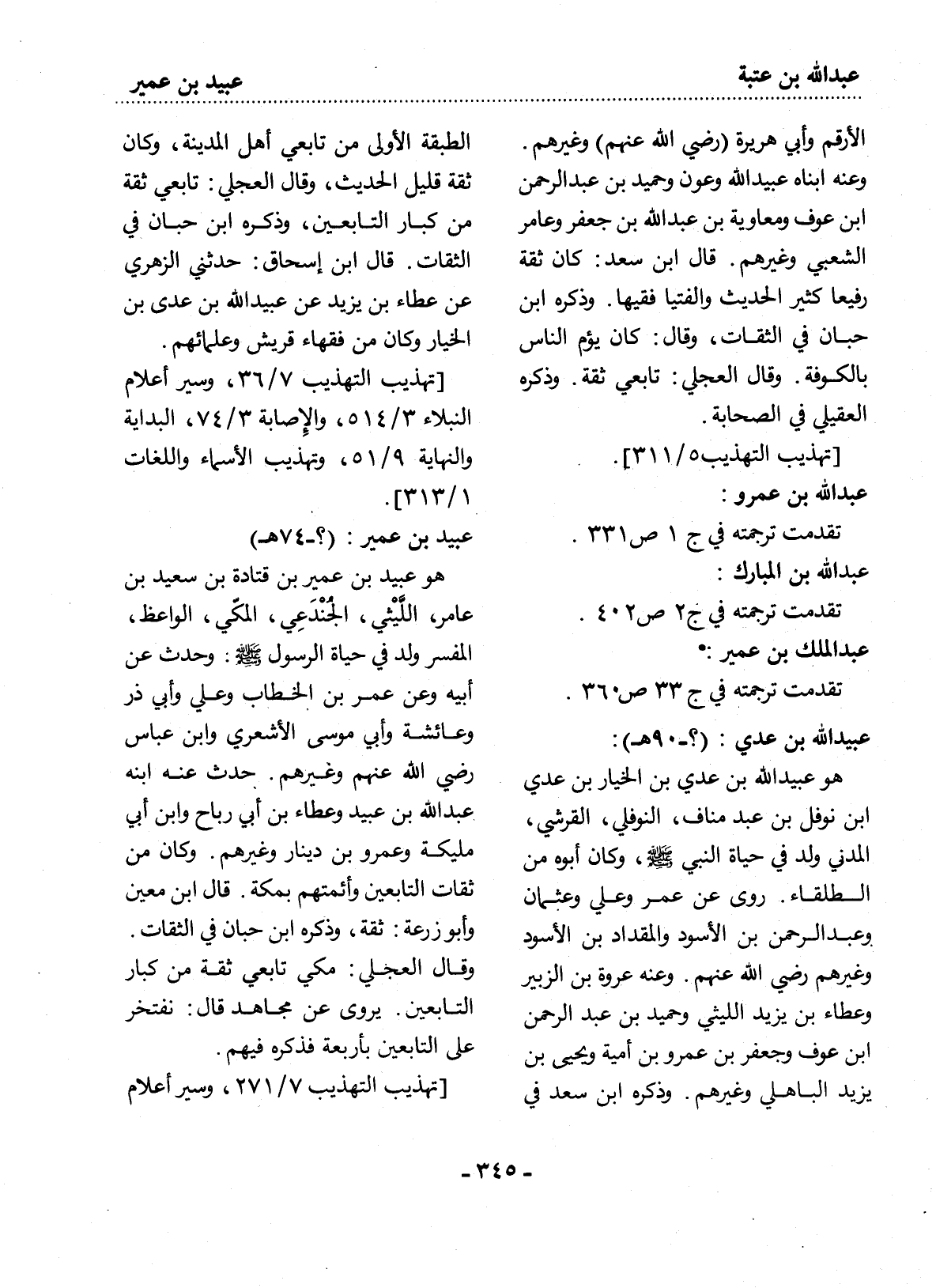 الأرقم وأبي هريرة (رضي الله عنهم) وغيرهم. وعنه ابناه عبيد الله وعون وحميد بن عبد الرحمن بن عوف ومعاوية بن عبد الله بن جعفر وعامر الشعبي وغيرهم. قال ابن سعد: كان ثقة رفيعا كثير الحديث والفتيا فقيها. وذكره ابن حبان في الثقات، وقال: كان يؤم الناس بالكوفة. وقال العجلي: تابعي ثقة. وذكره العقيلي في الصحابة. [تهذيب التهذيب 5 / 311] .
