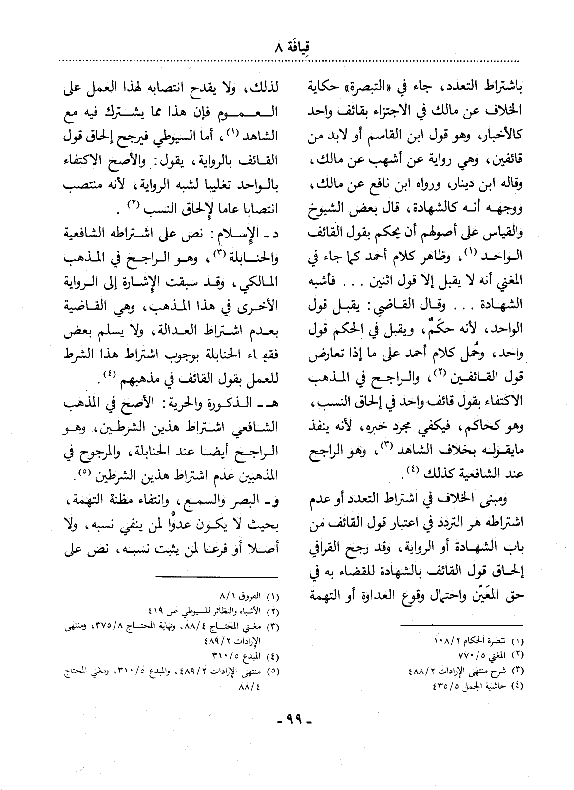 بِاشْتِرَاطِ التَّعَدُّدِ، جَاءَ فِي " التَّبْصِرَةِ " حِكَايَةُ الْخِلاَفِ عَنْ مَالِكٍ فِي الاِجْتِزَاءِ بِقَائِفٍ وَاحِدٍ كَالأَْخْبَارِ، وَهُوَ قَوْل ابْنِ الْقَاسِمِ أَوْ لاَ بُدَّ مِنْ قَائِفَيْنِ، وَهِيَ رِوَايَةٌ عَنْ أَشْهَبَ عَنْ مَالِكٍ، وَقَالَهُ ابْنُ دِينَارٍ، وَرَوَاهُ ابْنُ نَافِعٍ عَنْ مَالِكٍ، وَوَجْهُهُ أَنَّهُ كَالشَّهَادَةِ، قَال بَعْضُ الشُّيُوخِ وَالْقِيَاسُ عَلَى أُصُولِهِمْ أَنْ يُحْكَمَ بِقَوْل الْقَائِفِ الْوَاحِدِ (1) ، وَظَاهِرُ كَلاَمِ أَحْمَدَ كَمَا جَاءَ فِي الْمُغْنِي أَنَّهُ لاَ يُقْبَل إِلاَّ قَوْل اثْنَيْنِ. . . فَأَشْبَهَ الشَّهَادَةَ. . . وَقَال الْقَاضِي: يُقْبَل قَوْل الْوَاحِدِ؛ لأَِنَّهُ حُكْمٌ، وَيُقْبَل فِي الْحُكْمِ قَوْل وَاحِدٍ، وَحَمَل كَلاَمَ أَحْمَدَ عَلَى مَا إِذَا تَعَارَضَ قَوْل الْقَائِفَيْنِ (2) ، وَالرَّاجِحُ فِي الْمَذْهَبِ الاِكْتِفَاءُ بِقَوْل قَائِفٍ وَاحِدٍ فِي إِلْحَاقِ النَّسَبِ، وَهُوَ كَحَاكِمٍ، فَيَكْفِي مُجَرَّدُ خَبَرِهِ؛ لأَِنَّهُ يَنْفُذُ مَا يَقُولُهُ بِخِلاَفِ الشَّاهِدِ (3) ، وَهُوَ الرَّاجِحُ عِنْدَ الشَّافِعِيَّةِ كَذَلِكَ (4) .