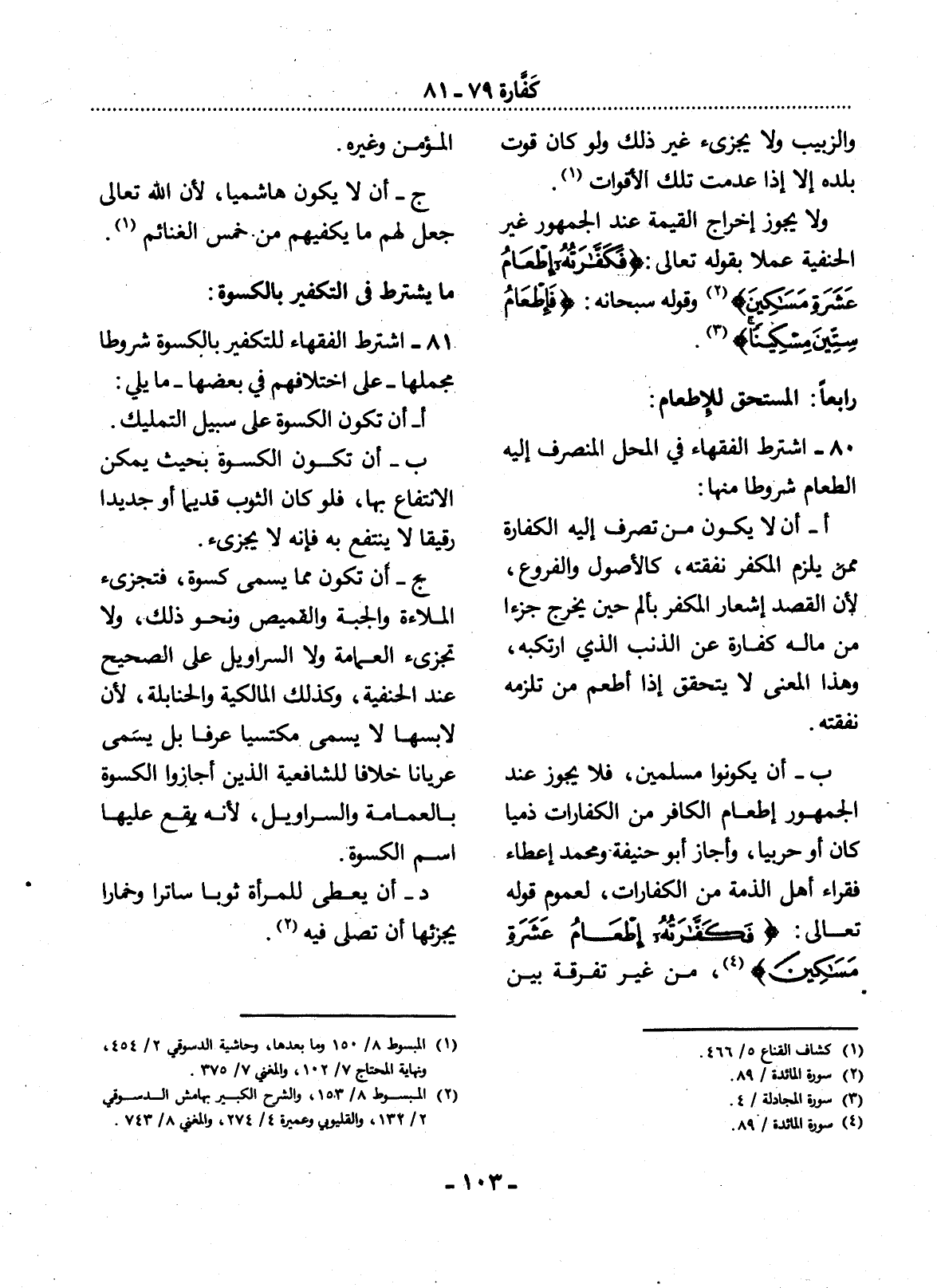 ب - أَنْ يَكُونُوا مُسْلِمِينَ، فَلاَ يَجُوزُ عِنْدَ الْجُمْهُورِ إِطْعَامُ الْكَافِرِ مِنَ الْكَفَّارَاتِ ذِمِّيًّا كَانَ أَوْ حَرْبِيًّا، وَأَجَازَ أَبُو حَنِيفَةَ - وَمُحَمَّدٌ إِعْطَاءَ فُقَرَاءِ أَهْل الذِّمَّةِ مِنَ الْكَفَّارَاتِ، لِعُمُومِ قَوْلِهِ تَعَالَى: {فَكَفَّارَتُهُ إِطْعَامُ عَشَرَةِ مَسَاكِينَ} (4) ، مِنْ غَيْرِ تَفْرِقَةٍ بَيْنَ