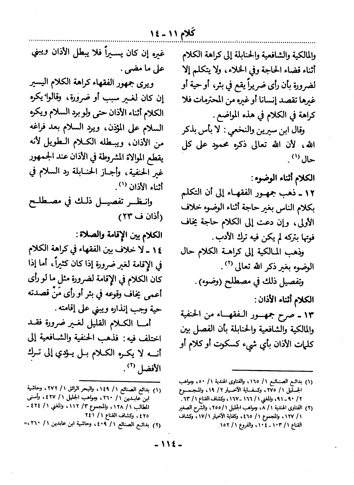 وَالْمَالِكِيَّةِ وَالشَّافِعِيَّةِ وَالْحَنَابِلَةِ إِلَى كَرَاهَةِ الْكَلاَمِ أَثْنَاءَ قَضَاءِ الْحَاجَةِ وَفِي الْخَلاَءِ وَلاَ يَتَكَلَّمُ إِلاَّ لِضَرُورَةٍ بِأَنْ رَأَى ضَرِيرًا يَقَعُ فِي بِئْرٍ، أَوْ حَيَّةً أَوْ غَيْرَهَا تَقْصِدُ إِنْسَانًا أَوْ غَيْرَهُ مِنَ الْمُحْتَرَمَاتِ فَلاَ كَرَاهَةَ فِي الْكَلاَمِ فِي هَذِهِ الْمَوَاضِعِ.