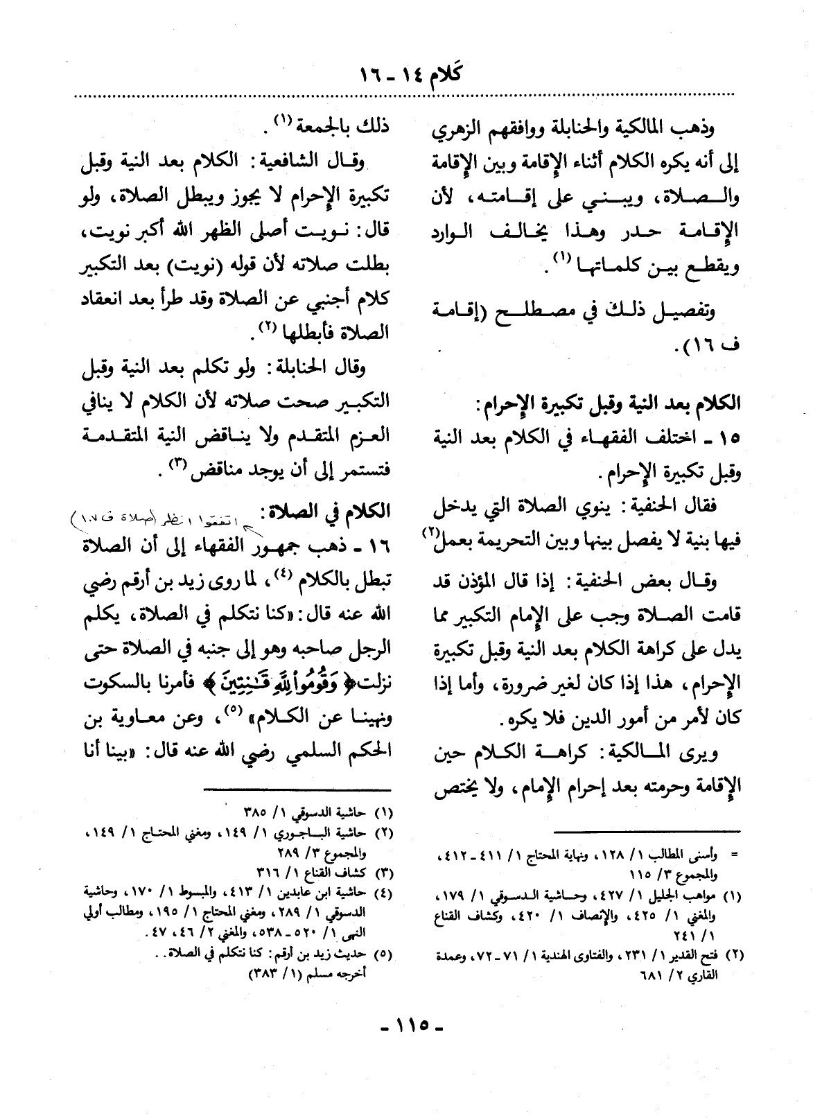 16 - ذَهَبَ جُمْهُورُ الْفُقَهَاءِ إِلَى أَنَّ الصَّلاَةَ تَبْطُل بِالْكَلاَمِ (4) لِمَا رَوَى زَيْدُ بْنُ أَرْقَمَ رَضِيَ اللَّهُ عَنْهُ قَال: كُنَّا نَتَكَلَّمُ فِي الصَّلاَةِ، يُكَلِّمُ الرَّجُل صَاحِبَهُ وَهُوَ إِلَى جَنْبِهِ فِي الصَّلاَةِ حَتَّى نَزَلَتْ {وَقُومُوا لِلَّهِ قَانِتِينَ} فَأُمِرْنَا بِالسُّكُوتِ وَنُهِينَا عَنِ الْكَلاَمِ (5) ، وَعَنْ مُعَاوِيَةَ بْنِ الْحَكَمِ السُّلَمِيِّ رَضِيَ اللَّهُ عَنْهُ قَال: