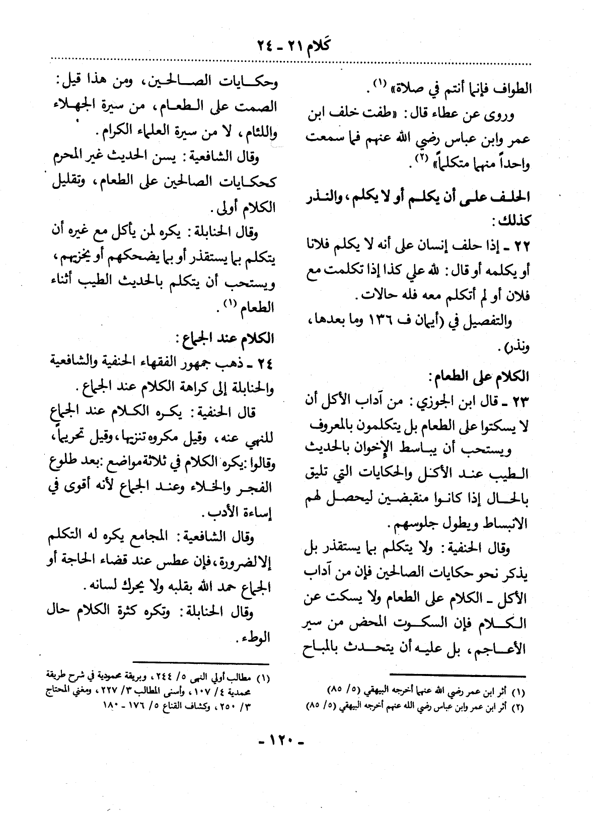 الطَّوَافِ فَإِنَّمَا أَنْتُمْ فِي صَلاَةٍ. (1) وَرُوِيَ عَنْ عَطَاءٍ قَال: ". . . . طُفْتُ خَلْفَ ابْنِ عُمَرَ وَابْنِ عَبَّاسٍ رَضِيَ اللَّهُ عَنْهُمْ فَمَا سَمِعْتُ وَاحِدًا مِنْهُمَا مُتَكَلِّمًا ". (2)