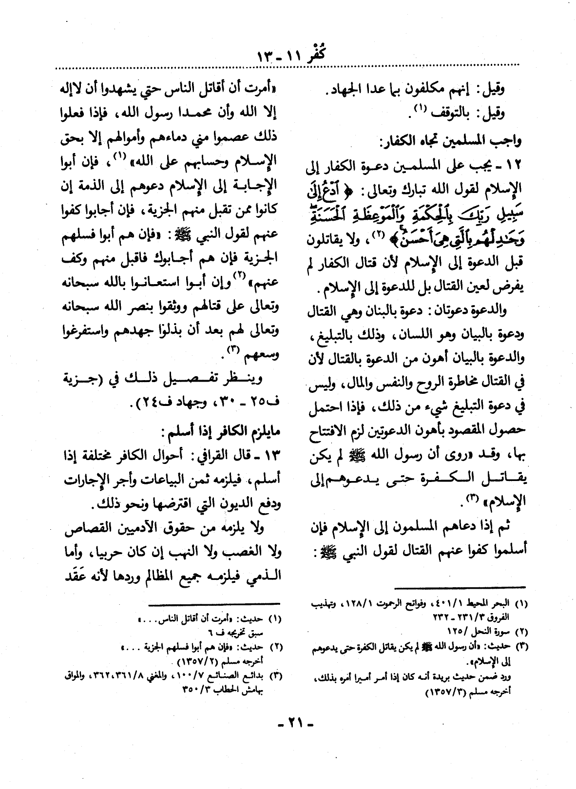 12 - يَجِبُ عَلَى الْمُسْلِمِينَ دَعْوَةُ الْكُفَّارِ إِلَى الإِْسْلاَمِ لِقَوْل اللَّهِ تَبَارَكَ وَتَعَالَى: {ادْعُ إِلَى سَبِيل رَبِّكَ بِالْحِكْمَةِ وَالْمَوْعِظَةِ الْحَسَنَةِ وَجَادِلْهُمْ بِالَّتِي هِيَ أَحْسَنُ} (2) ، وَلاَ يُقَاتَلُونَ قَبْل الدَّعْوَةِ إِلَى الإِْسْلاَمِ لأَِنَّ قِتَال الْكُفَّارِ لَمْ يُفْرَضْ لِعَيْنِ الْقِتَال بَل لِلدَّعْوَةِ إِلَى الإِْسْلاَمِ.