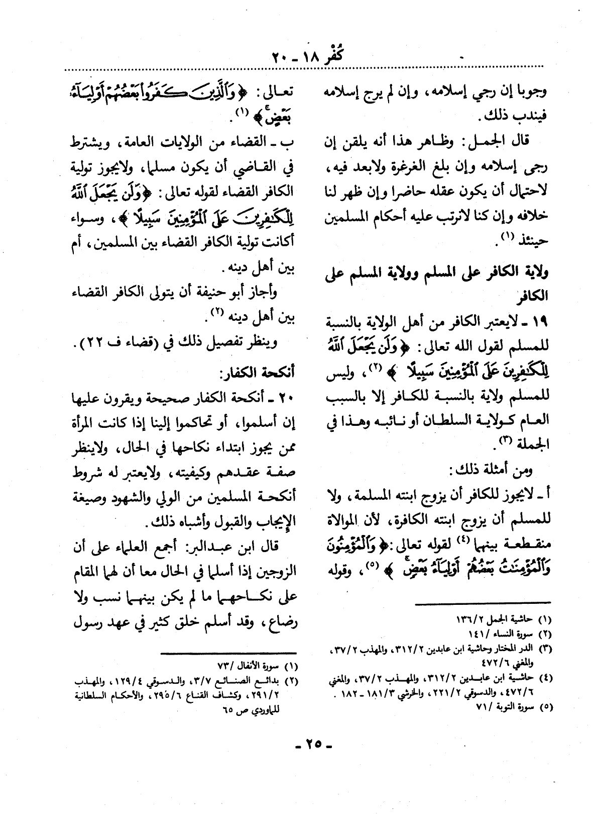 20 - أَنْكِحَةُ الْكُفَّارِ صَحِيحَةٌ وَيُقَرُّونَ عَلَيْهَا إِنْ أَسْلَمُوا، أَوْ تَحَاكَمُوا إِلَيْنَا إِذَا كَانَتِ الْمَرْأَةُ مِمَّنْ يَجُوزُ ابْتِدَاءُ نِكَاحِهَا فِي الْحَال، وَلاَ يُنْظَرُ صِفَةُ عَقْدِهِمْ وَكَيْفِيَّتُهُ، وَلاَ يُعْتَبَرُ لَهُ شُرُوطُ أَنْكِحَةِ الْمُسْلِمِينَ مِنَ الْوَلِيِّ وَالشُّهُودِ وَصِيغَةِ الإِْيجَابِ وَالْقَبُول وَأَشْبَاهِ ذَلِكَ.