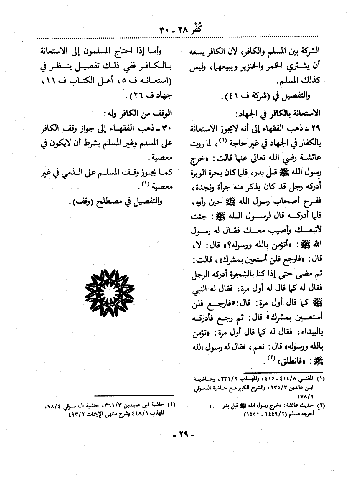 29 - ذَهَبَ الْفُقَهَاءُ إِلَى أَنَّهُ لاَ يَجُوزُ الاِسْتِعَانَةُ بِالْكَفَّارِ فِي الْجِهَادِ فِي غَيْرِ حَاجَةٍ (1) لِمَا رَوَتْ عَائِشَةُ رَضِيَ اللَّهُ تَعَالَى عَنْهَا قَالَتْ: خَرَجَ رَسُول اللَّهِ صَلَّى اللَّهُ عَلَيْهِ وَسَلَّمَ قِبَل بَدْرٍ، فَلَمَّا كَانَ بَحْرَةُ الْوَبَرَةِ أَدْرَكَهُ رَجُلٌ قَدْ كَانَ يُذْكَرُ مِنْهُ جُرْأَةٌ وَنَجْدَةٌ، فَفَرِحَ أَصْحَابُ رَسُول اللَّهِ صَلَّى اللَّهُ عَلَيْهِ وَسَلَّمَ حِينَ رَأَوْهُ، فَلَمَّا أَدْرَكَهُ قَال لِرَسُول اللَّهِ صَلَّى اللَّهُ عَلَيْهِ وَسَلَّمَ: جِئْتُ لأَِتْبَعَكَ وَأُصِيبَ مَعَكَ فَقَال لَهُ رَسُول اللَّهِ صَلَّى اللَّهُ عَلَيْهِ وَسَلَّمَ: أَتُؤْمِنُ بِاللَّهِ وَرَسُولِهِ؟ قَال: لاَ، قَال: فَارْجِعْ فَلَنْ أَسْتَعِينَ بِمُشْرِكٍ، قَالَتْ: ثُمَّ مَضَى حَتَّى إِذَا كُنَّا بِالشَّجَرَةِ أَدْرَكَهُ الرَّجُل فَقَال لَهُ كَمَا قَال لَهُ أَوَّل مَرَّةٍ، فَقَال لَهُ النَّبِيُّ صَلَّى اللَّهُ عَلَيْهِ وَسَلَّمَ كَمَا قَال أَوَّل مَرَّةٍ: قَال: فَارْجِعْ فَلَنْ أَسْتَعِينَ بِمُشْرِكٍ قَال: ثُمَّ رَجَعَ فَأَدْرَكَهُ بِالْبَيْدَاءِ، فَقَال لَهُ كَمَا قَال أَوَّل مَرَّةٍ: تُؤْمِنُ بِاللَّهِ وَرَسُولِهِ قَال: نَعَمْ، فَقَال لَهُ رَسُول اللَّهِ صَلَّى اللَّهُ عَلَيْهِ وَسَلَّمَ: فَانْطَلِقْ (2) .
